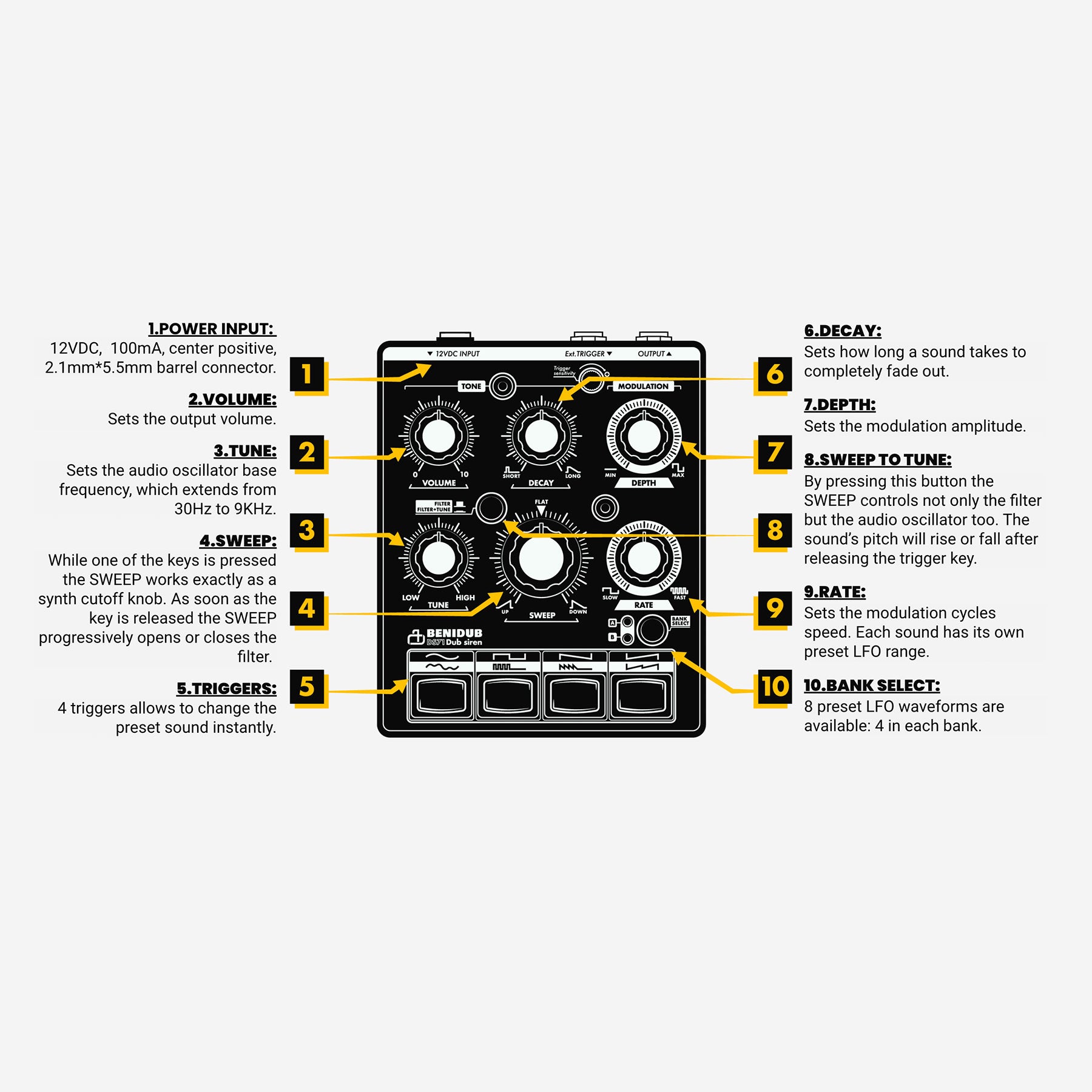 “The DS71 is a synthesizer designed to create many different dub siren sound at your fingertips. Analog synth voicing circuitry combined with a powerful digital LFO, a match held together by an intuitive array of controls and features for quick access to near infinite sounds palette. The DS71 differs from our other sirens for its modulation features and the range of the tone controls. The heart of the DS71 it’s the advanced digital LFO waveforms bank: 8 different sounds parameters at your disposal just by pressing one of the four trigger buttons. 'Bank A' for more traditional siren waveforms and 'Bank B' for more experimental, unusual and crazy waves. you’ll never go out of solutions and sounds with this circuit.” - Benidub