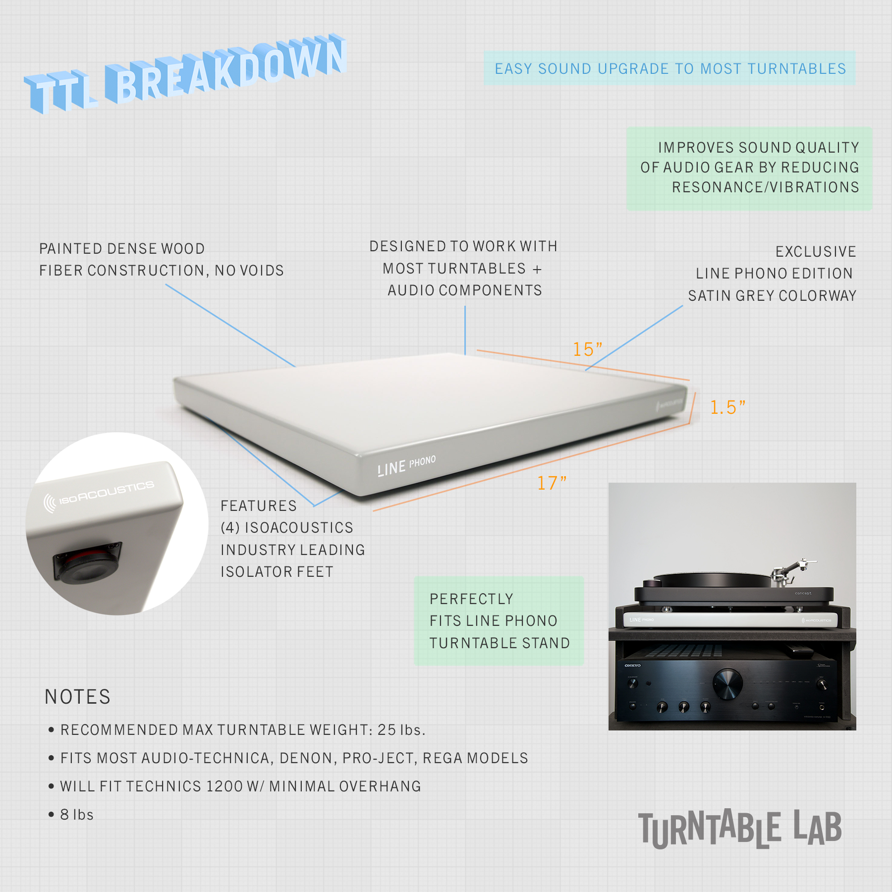 • works with most popular turntables up to 25 lbs. (most consumer turntables from Audio-Technica to Pro-Ject weigh less than 25 lbs., but check your model first)