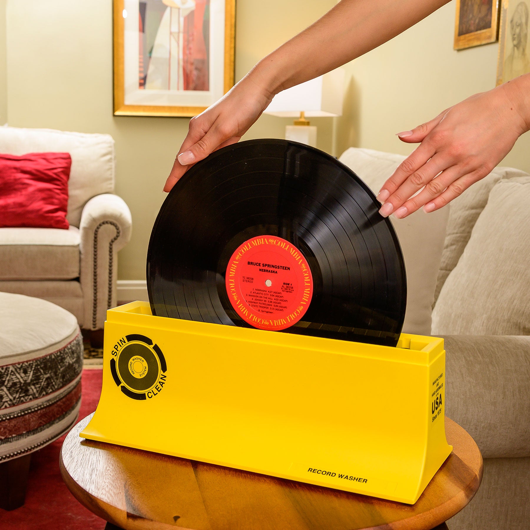 - easy to use, simply insert record into the signature yellow tank and spin both clockwise and counterclockwise to clean record