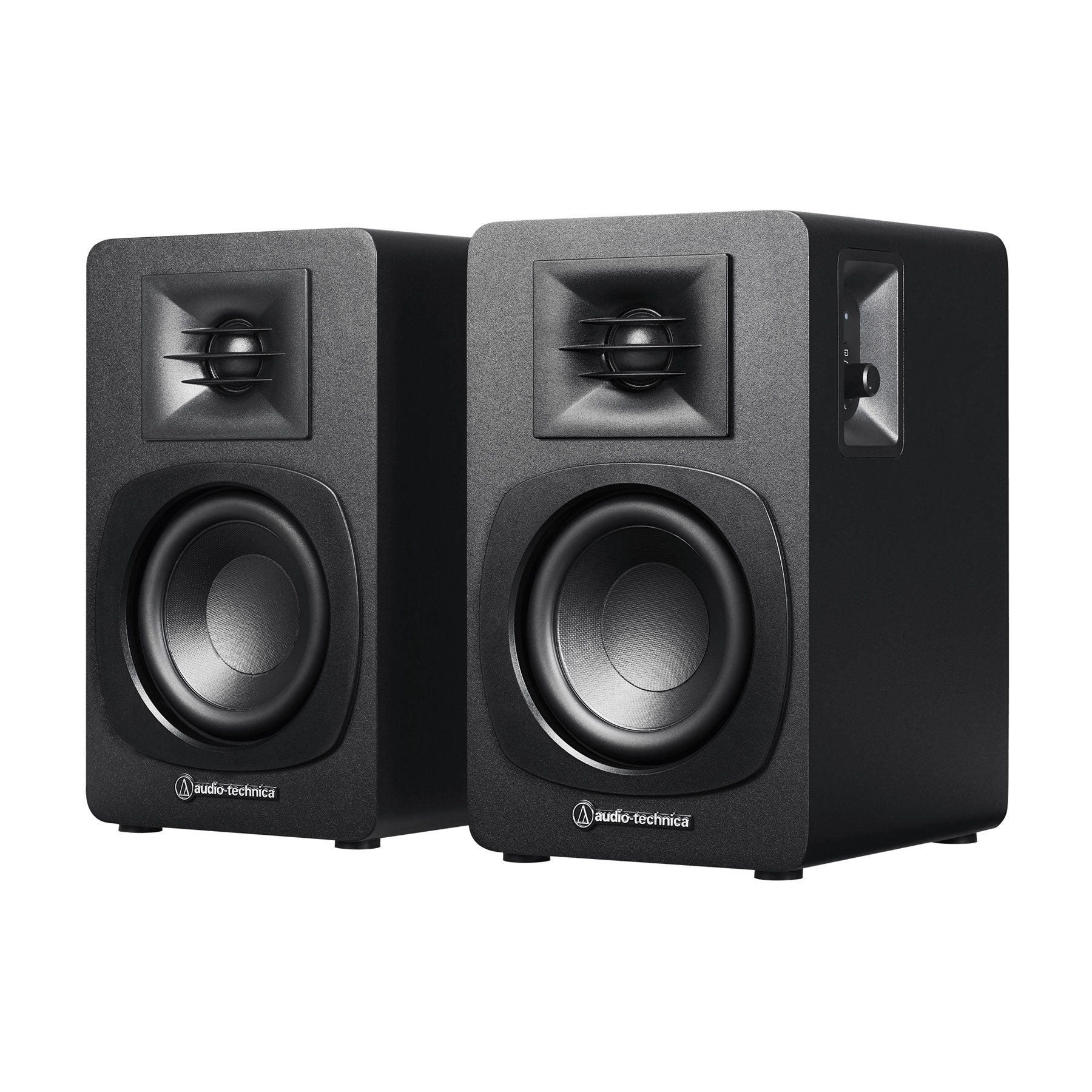 "Perfect for use with turntables, computers, smartphones or other devices, the AT-SP3X powered bookshelf speakers deliver rich, full-range audio via a wired or wireless connection. These compact, unobtrusive speakers elevate the listening experience in any room. They feature 3" woofers and 1.1" tweeters specially tuned by a built-in DSP to produce powerful, well-balanced sound for music, movies, and more." - Audio-Technica