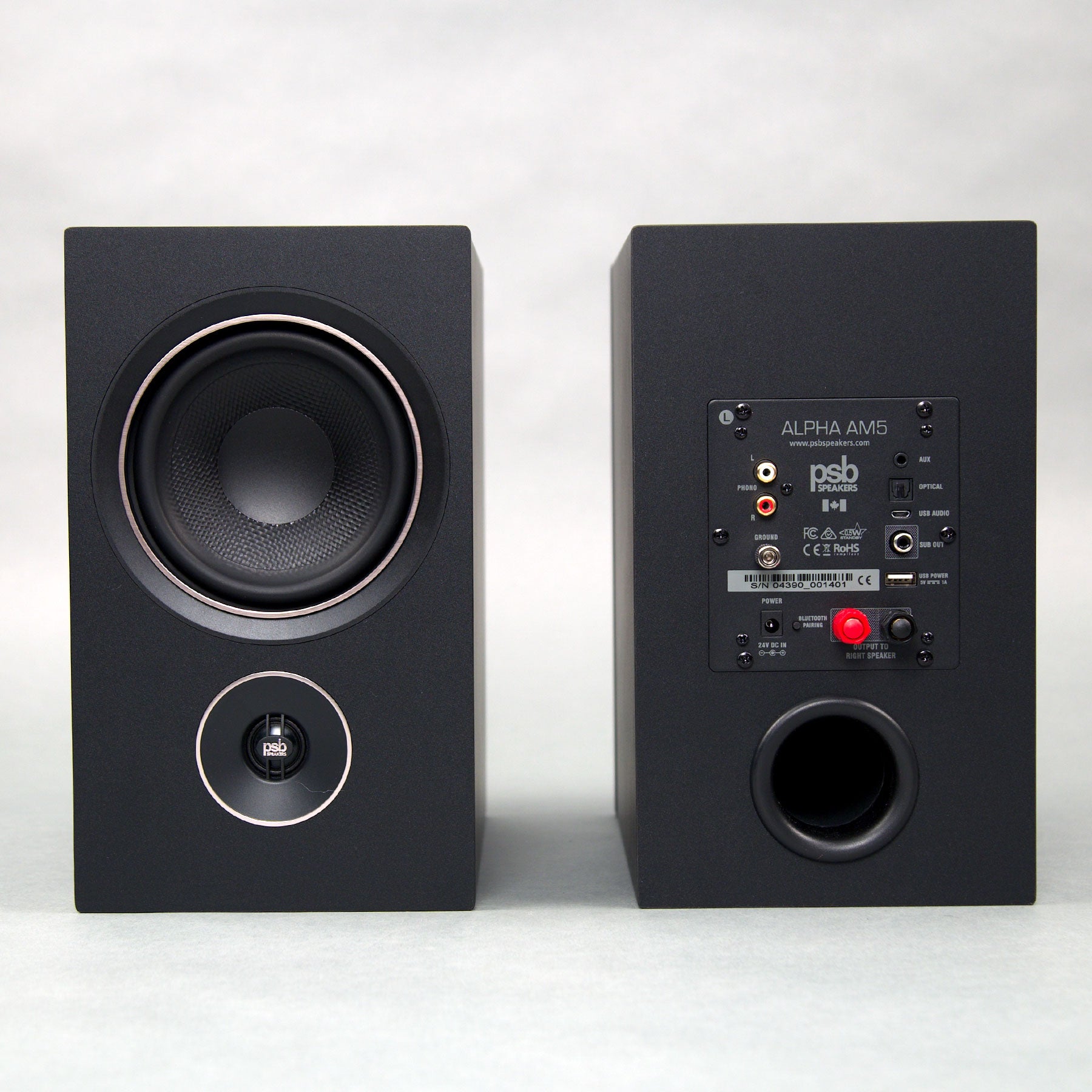 "The Alpha AM5 is a powered two-speaker stereo system that will revolutionize your traditional home audio experience. Featuring trickle-down acoustic technology from PSB’s most iconic speaker designs, the AM5 powered speaker includes a custom designed driver set with a 0.75” aluminium ferrofluid-cooled tweeter and a 5.5” midbass woofer that together deliver a rich and detailed full-range sound. You can listen to favourites on vinyl with a built-in phono preamp, or stream music and playlists with high-quality Qualcomm aptX Bluetooth. It’s PSB legendary sound, for everything you listen to and enjoy." - PSB Speakers