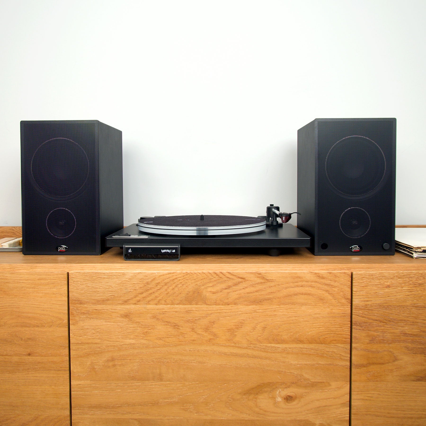 - large powered bookshelf speakers w/ built-in phono preamp + wireless bluetooth connectivity