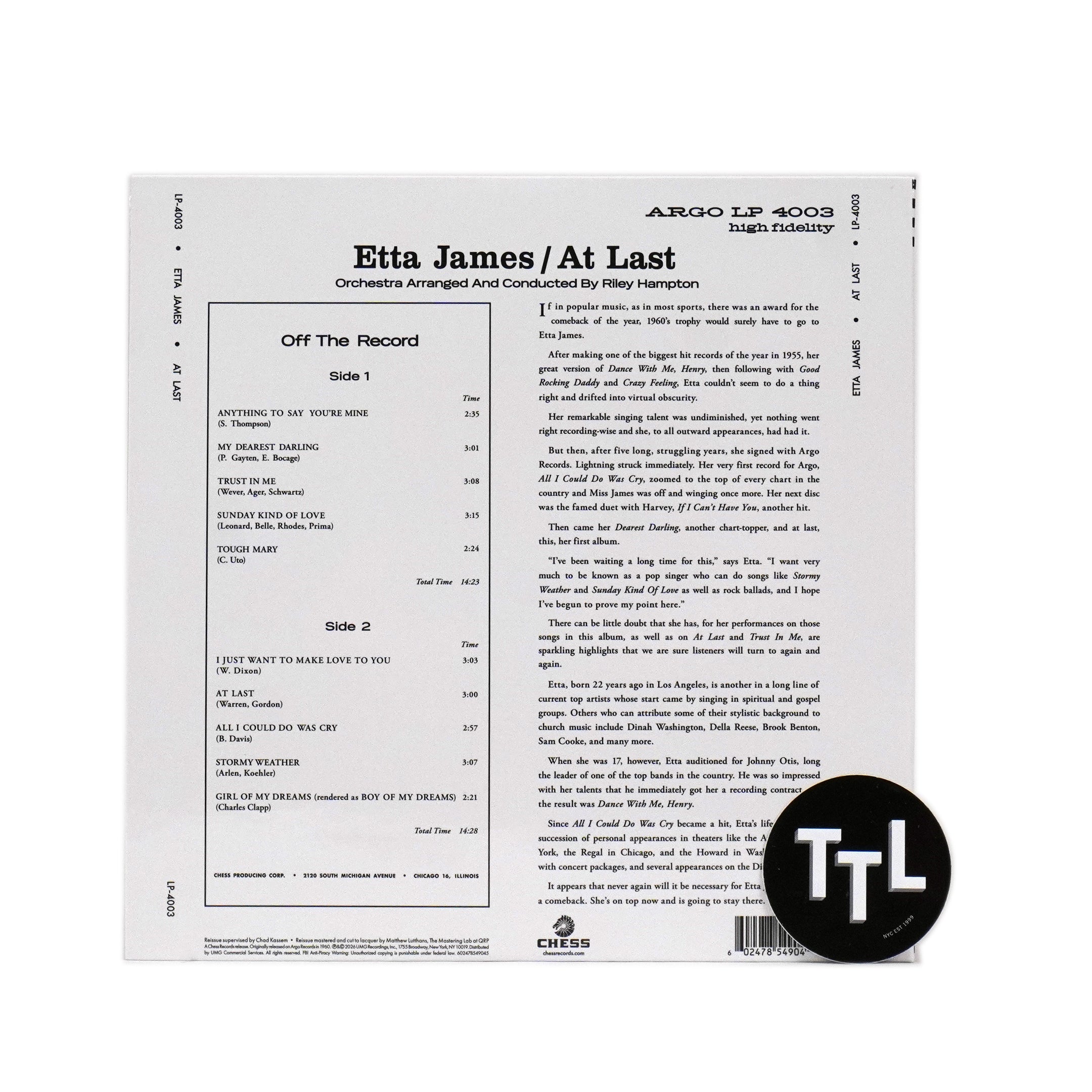 "Chess Records was more than the home of guitar-driven blues; their Argo imprint was the longtime home of Etta James, whose powerful voice remains a gold standard for pop and soul’s most impassioned belters. 1960’s At Last - bolstered by renditions of 'Stormy Weather,' 'A Sunday Kind of Love,' 'I Just Want to Make Love to You' and the immortal title track, which became her signature song - is perhaps the purest essence of Etta’s craft pressed onto vinyl. Bring home the sound of America’s greatest blues label in high fidelity with the Chess Records 75th Anniversary Series. These audiophile reissues of classic albums and compilations from the Chess discography are remastered from the original analog tapes and pressed on 180-gram vinyl at Quality Record Pressings (QRP). Each disc is packaged in tip-on gatefold sleeves printed on high-grade board." - Chess