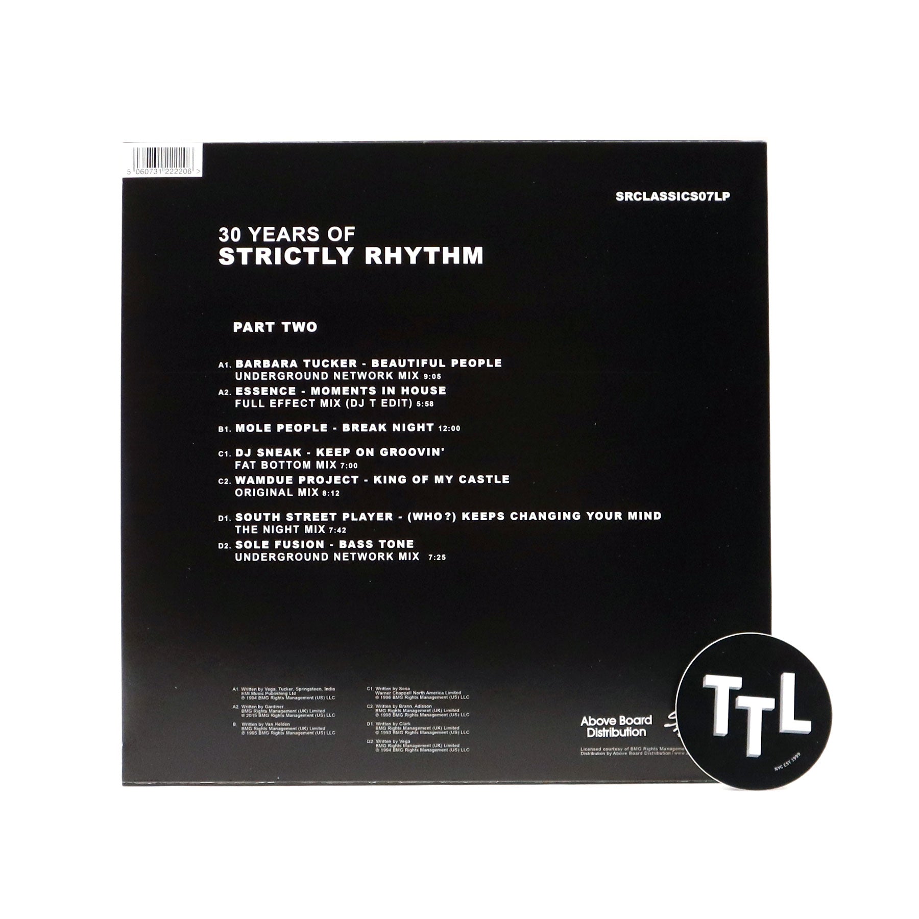 "Legendary NYC house label STRICTLY RHYTHM celebrates 3 decades of cutting edge house with 3 remastered double vinyl albums. The 2nd of 3, this 7-song compilation includes BARBARA TUCKER, ESSENCE, MOLE PEOPLE, DJ SNEAK, WAMDUE PROJECT, SOUTH STREET PLAYER, & SOUL FUSION." - Strictly Rhythm