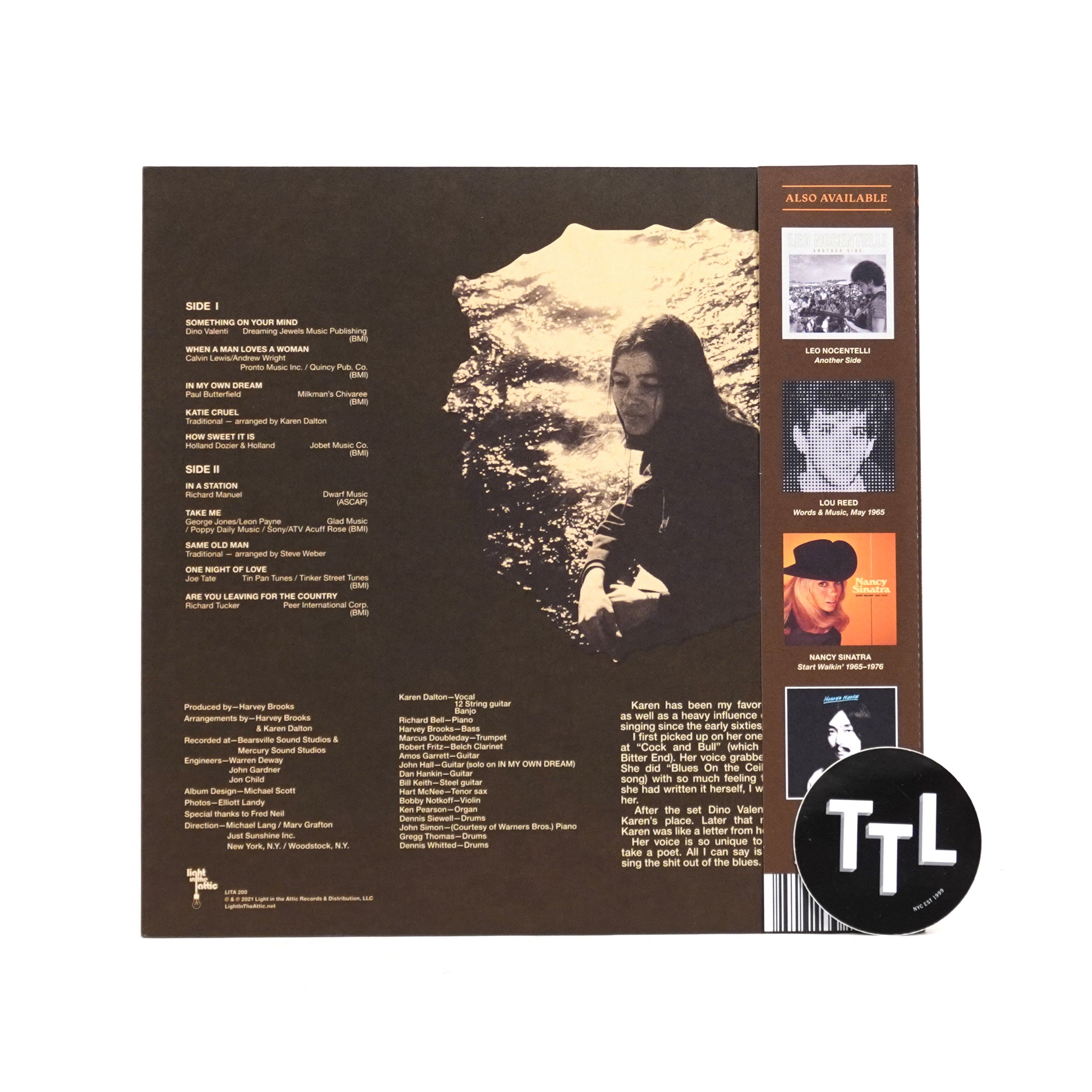 "Recorded over a six-month period in 1970/71 at Bearsville, In My Own Time was Karen Dalton’s only fully planned and realized studio album. The material was carefully selected and crafted for her by producer/musician Harvey Brooks, the Renaissance man of rock-jazz who played bass on Dylan’s Highway 61 Revisited and Miles’ Bitches Brew. It features ten songs that reflect Dalton's incredible ability to break just about anybody's heart – from her spectral evocation of Joe Tate's 'One Night of Love' to the dark tragedy of the traditional 'Katie Cruel.' Known as a great interpreter of choice material, Dalton could master both country and soul genres with hauntingly pining covers of George Jones' 'Take Me' and Holland-Dozier-Holland's 'How Sweet It Is.'" - Light In The Attic