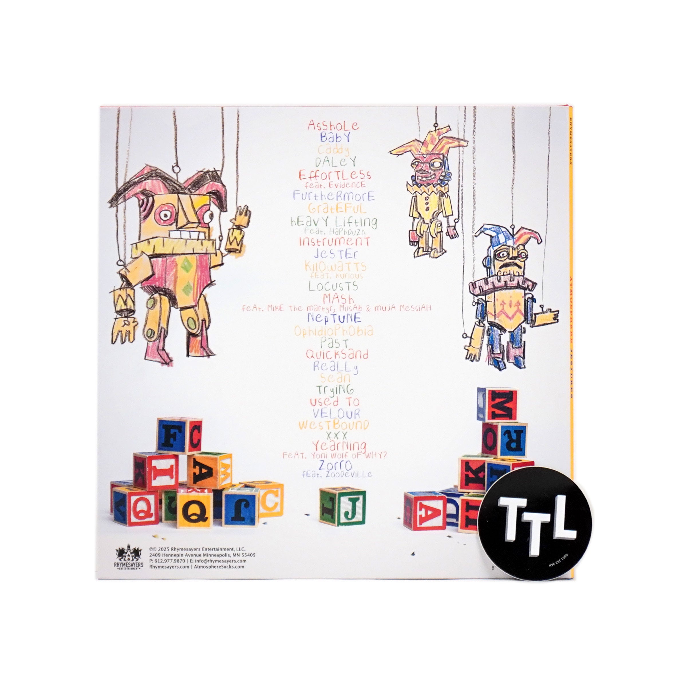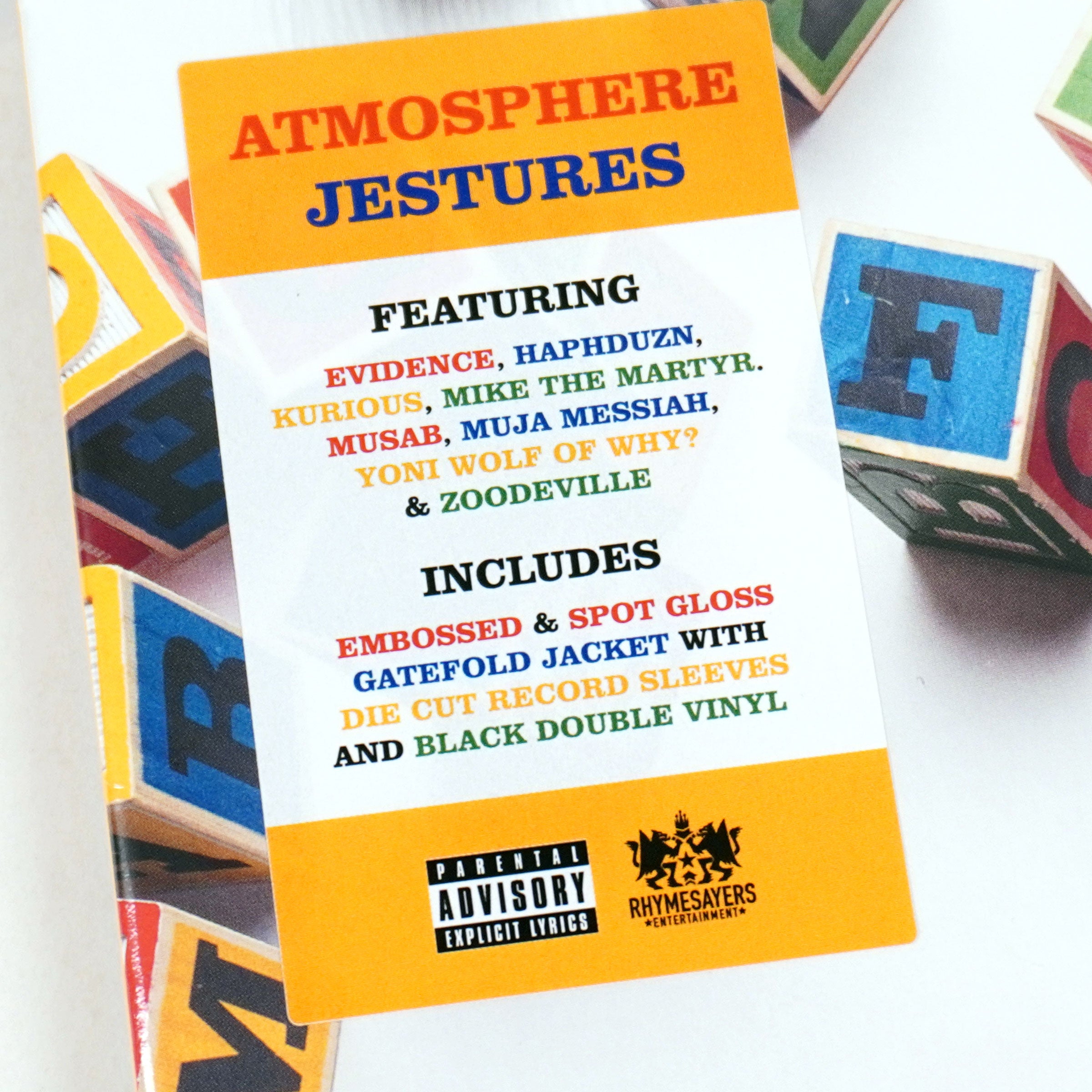 • "On Jestures, Atmosphere’s sprawling new album, Slug digs into the friction of middle-aged domesticity and stability, uncovering the quiet tensions that shape creative life. Long past the belief that great art needs great pain, he challenges the trope that creativity must be born from trauma. Instead, Atmosphere’s fifth release of the 2020s reflects a more grounded kind of struggle—one rooted in reflection, routine, and the work of becoming. The album’s ambitious structure mirrors its introspection: 26 songs, each titled with a different letter of the alphabet and sequenced from A to Z. Even guest appearances follow suit— Evidence lands on 'Effortless,' Kurious on 'Kilowatts,' and Musab, Muja Messiah, and Mike the Martyr appear on 'Mash.' Many tracks are strikingly short—one or two verses at most—delivering sharp ideas with precision and restraint. More than a look back, Jestures is a meditation on movement and meaning. Slug weaves memory and present-day reality over Ant’s richly textured beats, blending electro-glitch, warm twang, and cinematic drones. It’s a mosaic of life’s overlooked moments—how a partner’s habits, a child’s quirks, or a passing sound can reveal something new. What emerges is a story of progress, building toward a future defined by resilience and creative clarity." - Rhymesayers