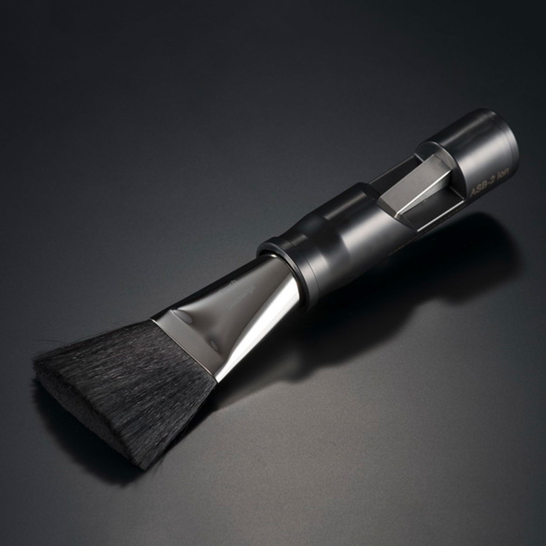 "The ASB-2 ion is a revolutionary static eliminating brush incorporating the world's only core-and-sheath composite conductive acrylic fiber 'COREBRID TMB' developed by Mitsubishi Chemical Corporation. Most antistatic brushes remove static electricity through corona discharge. However, brushing disc media to remove dust can often generate new floating static fields. The ASB-2 ion solves this problem with a final static eliminating punch – a built-in ionizer emitting a flow positive and negative ion, eliminating any static generated while brushing your disc media. The ASB-2’s built-in ionizer sends a flow of positive ions from the top of the brush handle when the lever is pressed and negative ions when the lever is released. The ASB-2 ion requires no batteries and can be used over and over again." - Furutech