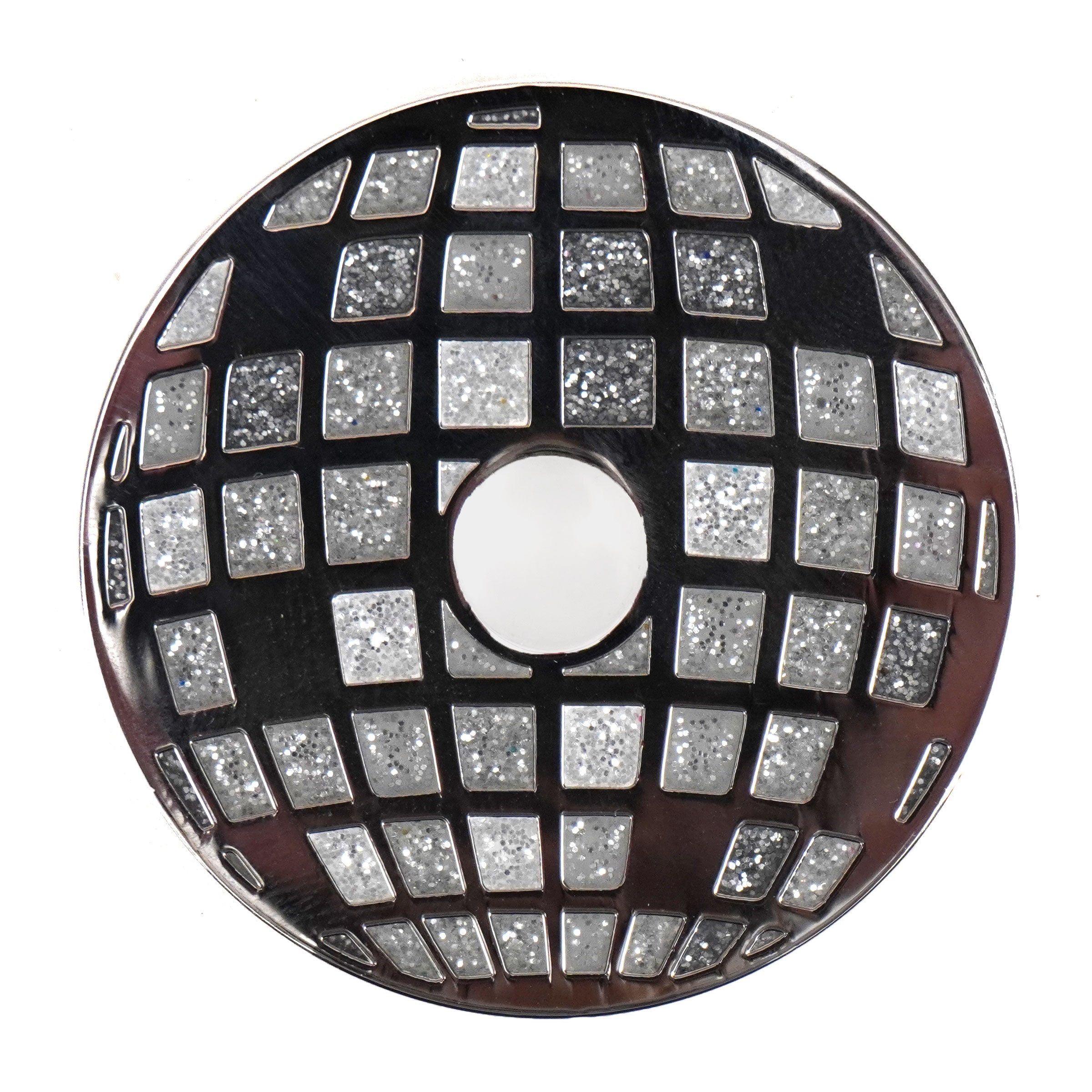 "Flair for your vinyl. Slide one of our weighted 45 rpm adaptors onto the spindle of your turntable to play your favorite 7”. The heavy duty enameled metal disc comes packaged in our custom muslin pouch, perfect for toting along to a party or your next spin session." - Love And Victory