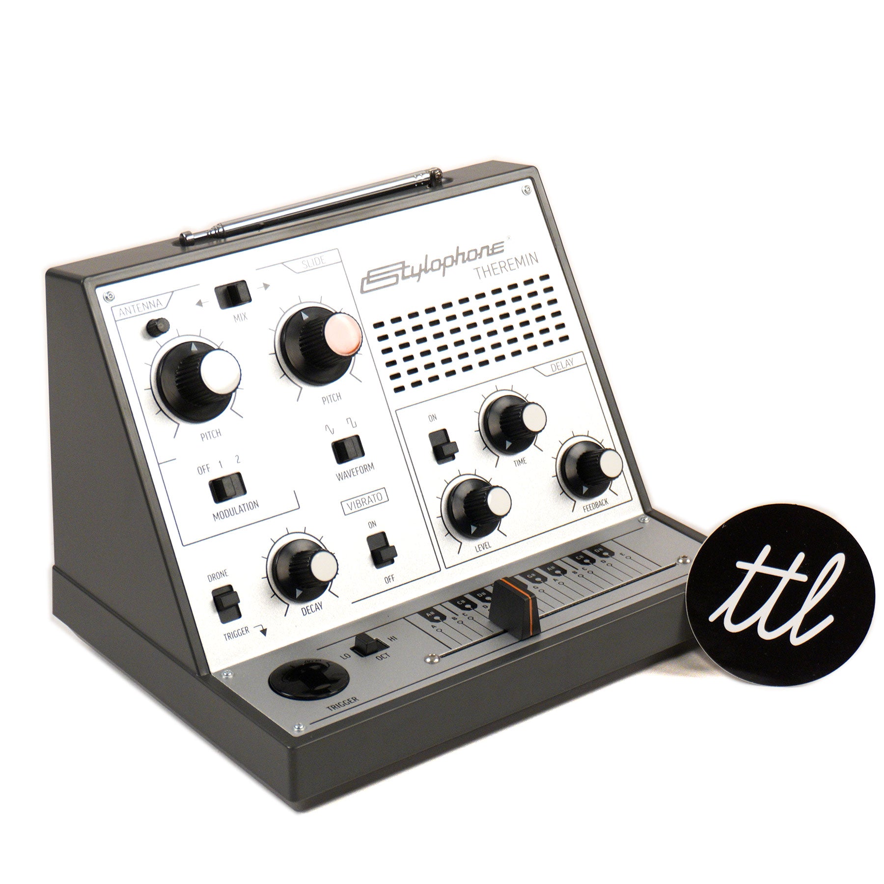 "The Stylophone Theremin is a portable touch sensitive synthesizer that creates experimental sounds by detecting your movement. Wave your hand around its antenna, move its slider from side to side, and go over the edge with mad modulation, wobbly vibrato, and crunchy echoing delay for crazy, quirky, sci-fi sound creation. Whether you’re a music maker, a beginner synth enthusiast, or you just want to have fun making noise, the Stylophone Theremin is a pitch only Theremin and takes the retro analog sound of a synth icon and makes it wilder than ever." - Stylophone