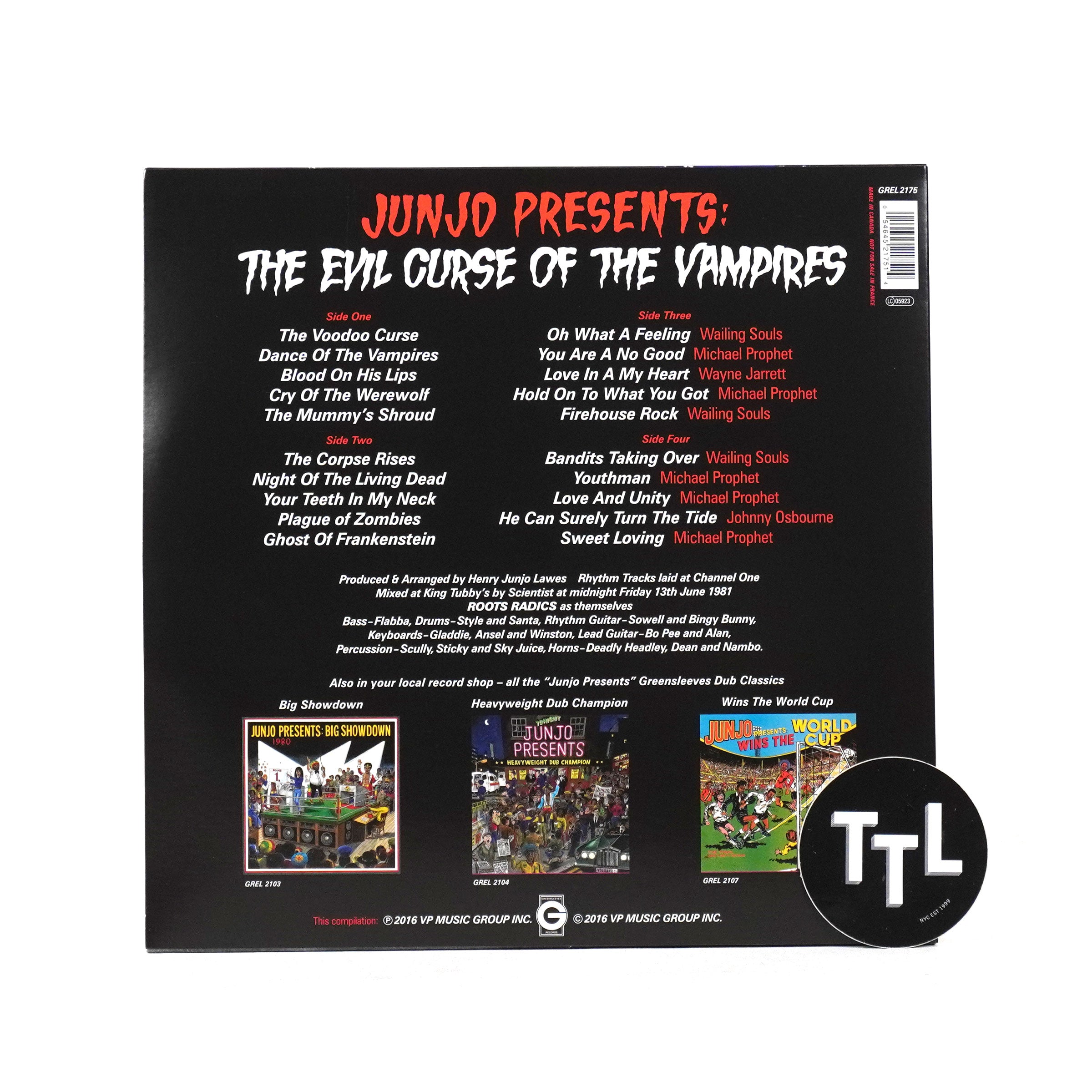 Produced by Junjo Lawes, backed by the Roots Radics, engineered by Scientist, mixed at King Tubby's 1981: a rhythm lovers dream combination. One of the most smoked out dub albums of all time, Scientist really breaks down into some dark and lurking places in pursuit of the vampires. Most of the rhythm tracks come from the Wailing Souls' equally classic Waterhouse Rock and both were released to big sales on the Greensleeves label. All of the tracks have a really complete feel to them and change up the mood as they go. My favorite is the first one on the second side (Toyan's "Capitol Offense") where Scientist rewinds Toyan's lyrics and fires up the bassline in a soundclash style "Scientist ya too hot..." Great album cover (in case you can't tell, that's Scientist on a boat blasting rhythms at the monsters from behind his mixing console) and the monster theme runs throughout. The first time I realized how crazy this record was I was laying in a hot bath with the record turned up. I had to jump out and rewind. Official Greensleeves double vinyl version includes the original vocal cuts on the second LP and a giant fold-out poster (note: for curious legal reasons, recent Greensleeves pressings credit the album to producer Junjo Lawes instead of Scientist, but it contains the same audio). Recommended.