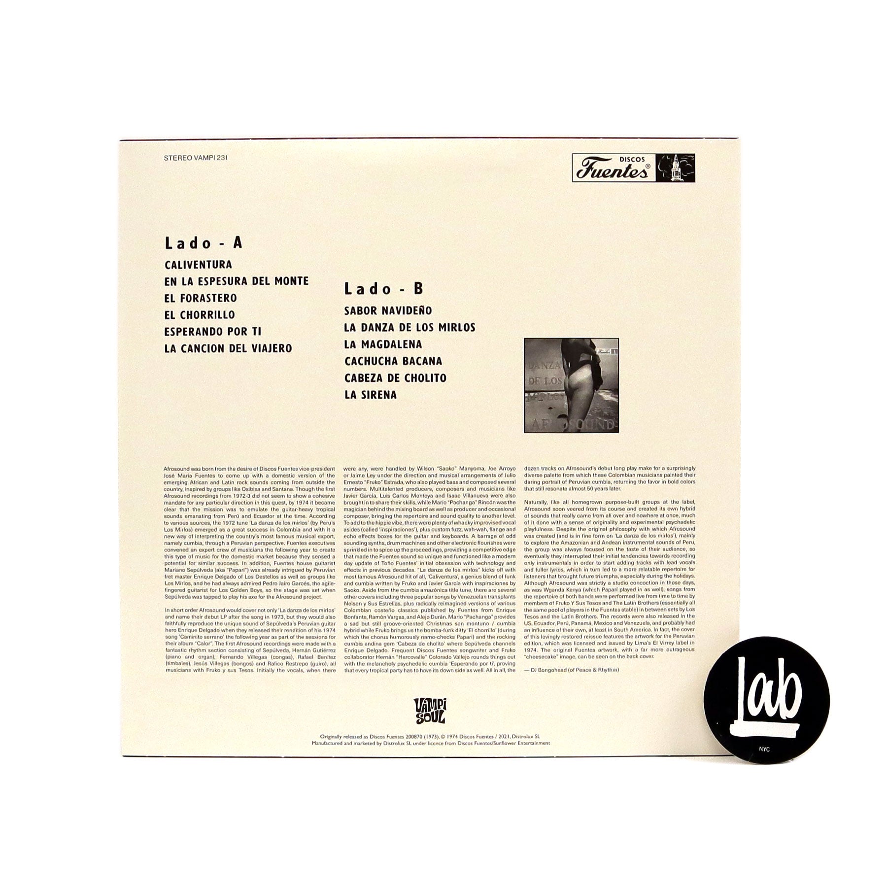 • "Vampisoul present a reissue of Afrosound's La Danza De Los Mirlos, originally released in 1973. Afrosound was born from the desire of Discos Fuentes vice-president José María Fuentes to come up with a domestic version of the emerging African and Latin rock sounds coming from outside the country, inspired by groups like Osibisa and Santana. The mission was to emulate the guitar-heavy tropical sounds emanating from Perú and Ecuador at the time. According to various sources, the 1972 tune 'La Danza De Los Mirlos' (by Peru's Los Mirlos) emerged as a great success in Colombia and with it a new way of interpreting the country's most famous musical export, namely cumbia, through a Peruvian perspective. Afrosound would cover not only 'La Danza De Los Mirlos' and name their debut LP after the song in 1973, but they would also faithfully reproduce the unique sound of their guitar hero Enrique Delgado. All in all, the dozen tracks on Afrosound's debut long play make for a surprisingly diverse palette from which these Colombian musicians painted their daring portrait of Peruvian cumbia, returning the favor in bold colors that still resonate almost 50 years later. The original Fuentes artwork, with a far more outrageous 'cheesecake' image, can be seen on the back cover." - Vampi Soul