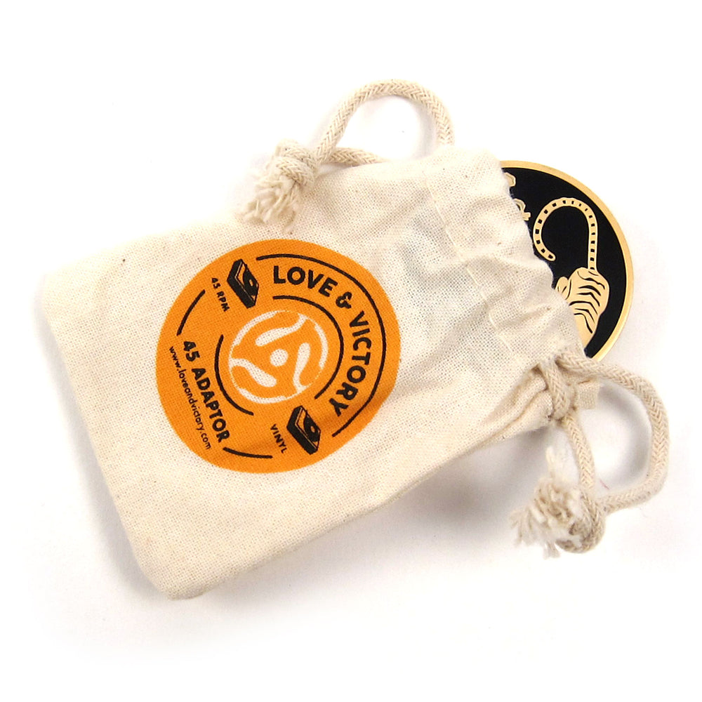 "Flair for your vinyl. Slide one of our weighted 45 rpm adaptors onto the spindle of your turntable to play your favorite 7”. The heavy duty enameled metal disc comes packaged in our custom muslin pouch, perfect for toting along to a party or your next spin session." - Love And Victory