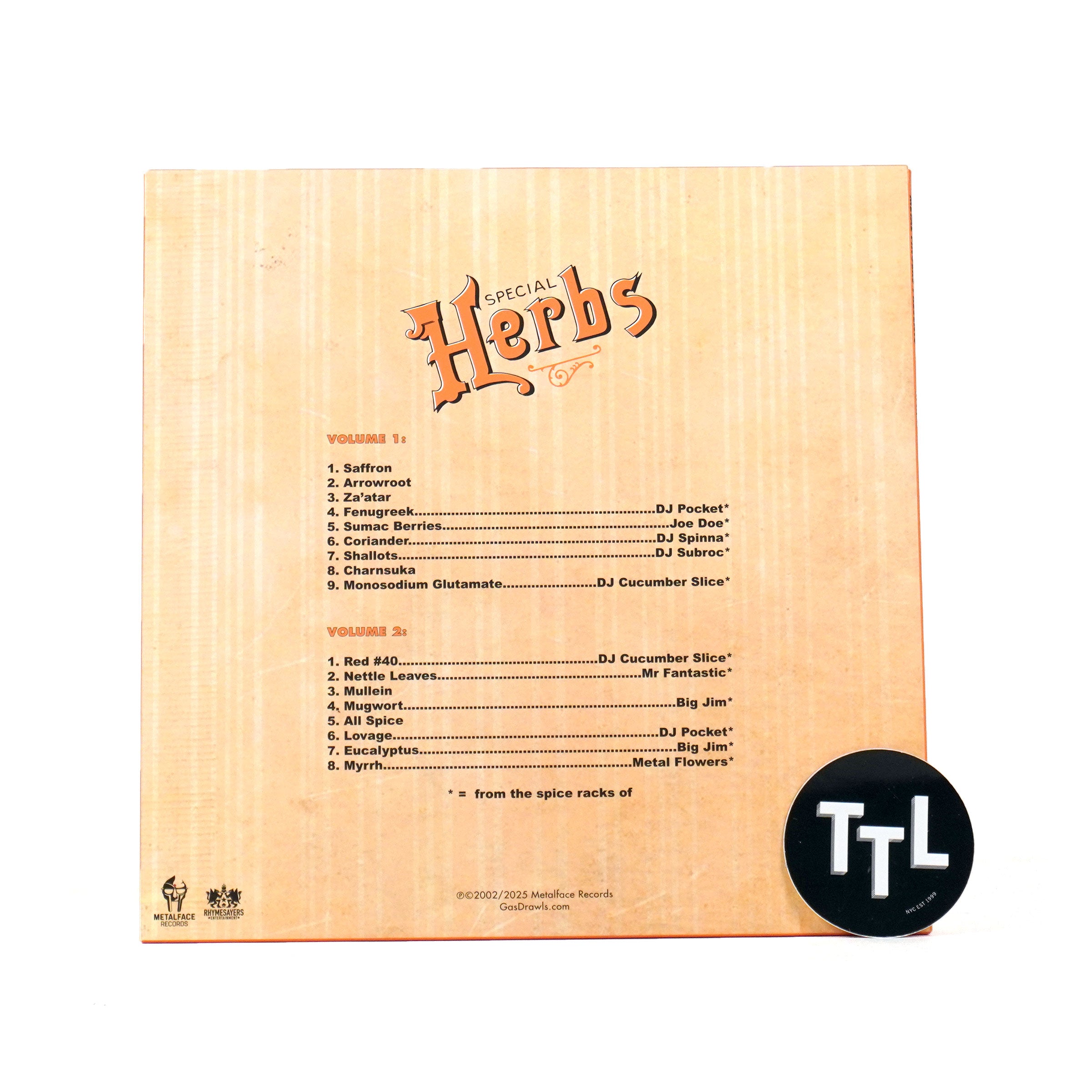 Official Rhymesayers version of the original Doom beats comp. Special Herbs Vol. 1 & 2 features 16 beats from the Doom files, some of them unreleased instrumentals from the Operation Doomsday, King Geedorah, and KMD albums. Sample some for yourself: the Axelrod loveliness of "Sumac Berries," the break down funk on "Coriander," the slow build-up and deep drops on "Charnsuka" or the smoothed out lead track "Saffron."