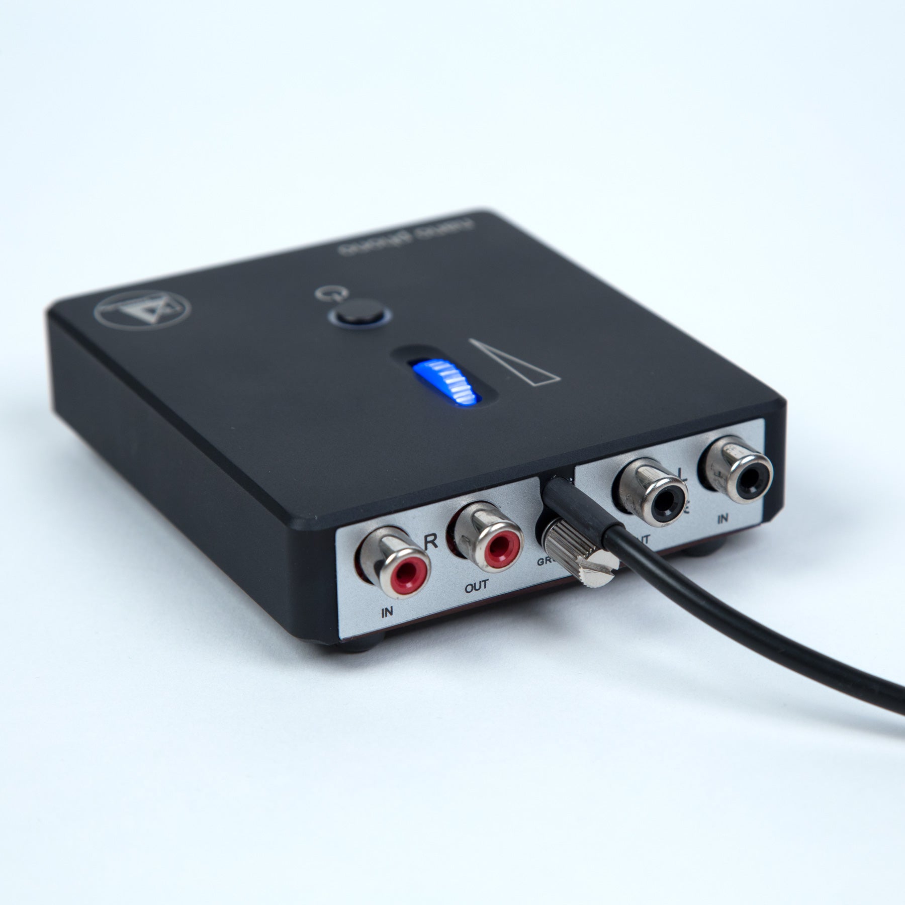 "Its meticulously selected SMD (Surface-Mount Device) components are assembled by hand in Erlangen and tested several times. The reward of these efforts is a signal to noise ratio of up to 84 decibels. The input impedance is set using plug-in links, so there is no loss of quality when using different moving magnet and moving coil cartridges."