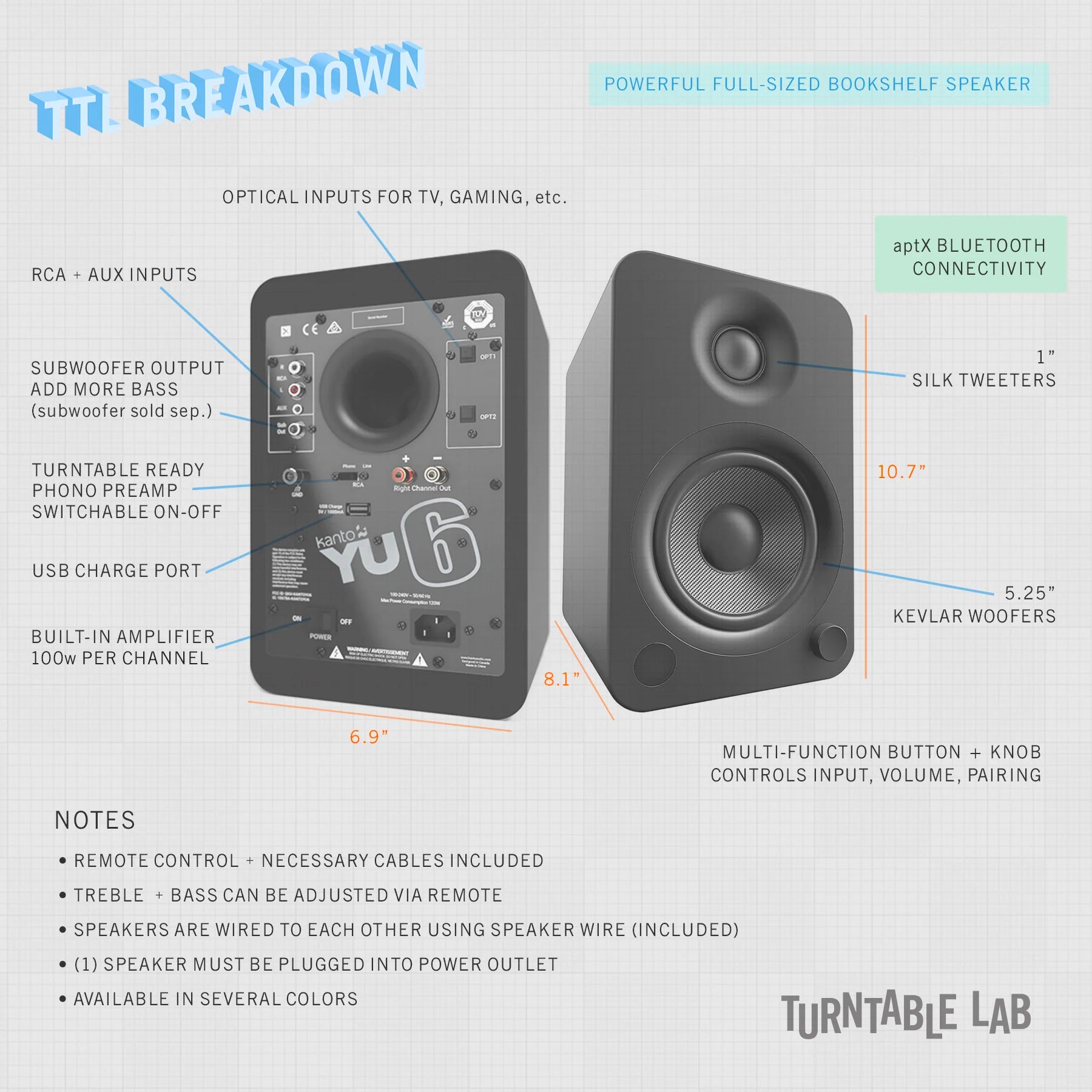 "Armed with a formidable Class D amplifier pumping out 200W peak power, YU6 will have you questioning what it really means to be loud. Its 5.25" Kevlar drivers and 1" silk dome tweeters inject detailed sound into every square inch of living space, evoking emotions that can only be expressed with an ear-to-ear grin. A built-in phono preamp makes it easy to spin your favorite tunes, while Bluetooth connectivity lets you keep the party going from the palm of your hand." - Kanto