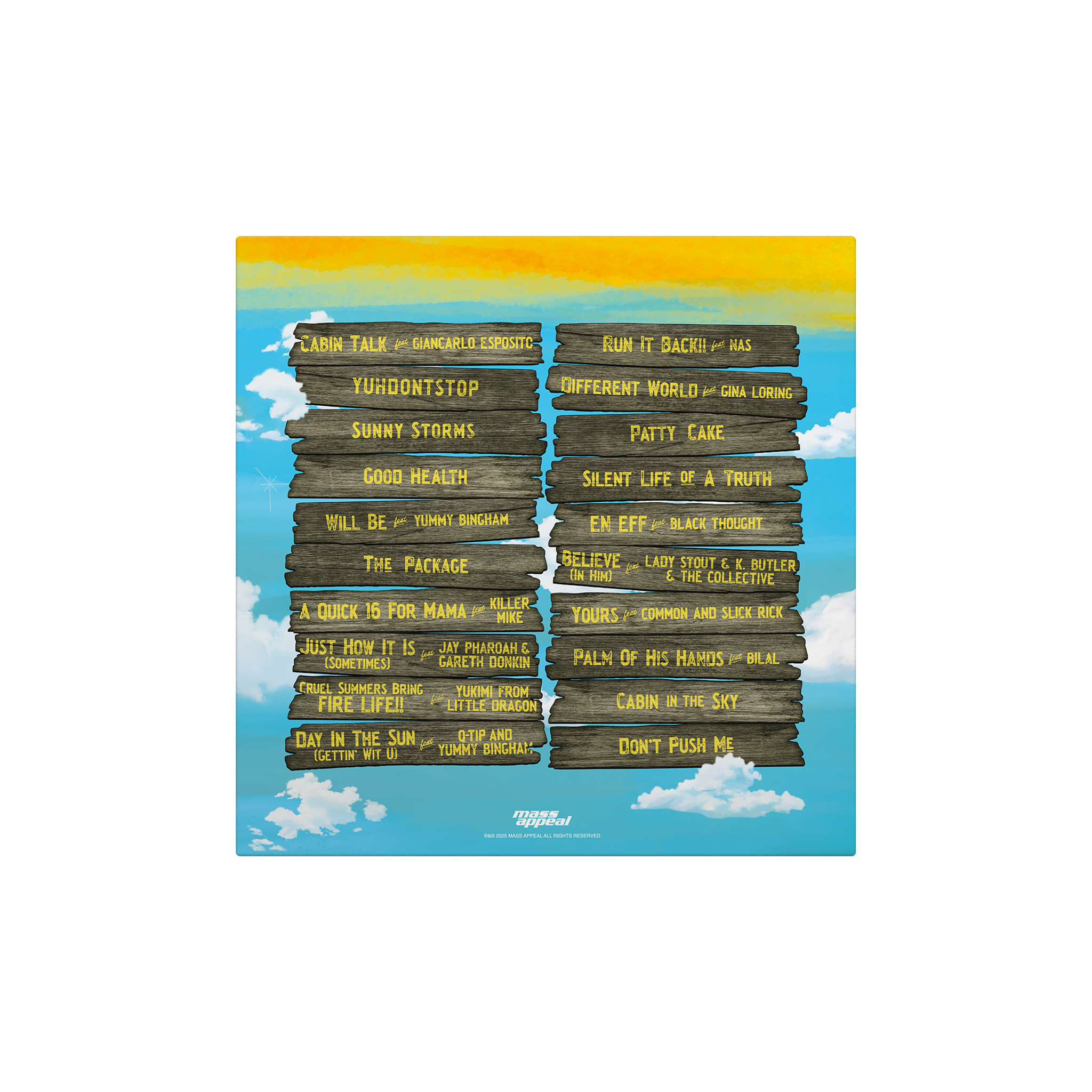 "De La Soul returns with Cabin in The Sky, a deeply personal and emotionally charged album. More than just a collection of songs, this project serves as a journey through reflection, love, and healing, a space where pain transforms into art, and remembrance turns into rhythm. The album honors the legacy of Dave 'Trugoy the Dove' Jolicoeur, and extends that tribute to all loved ones lost along the way. Through reflective lyricism, soulful samples, and the unmistakable De La groove, Cabin in The Sky captures the beauty and the heartbreak of carrying on." - Mass Appeal
