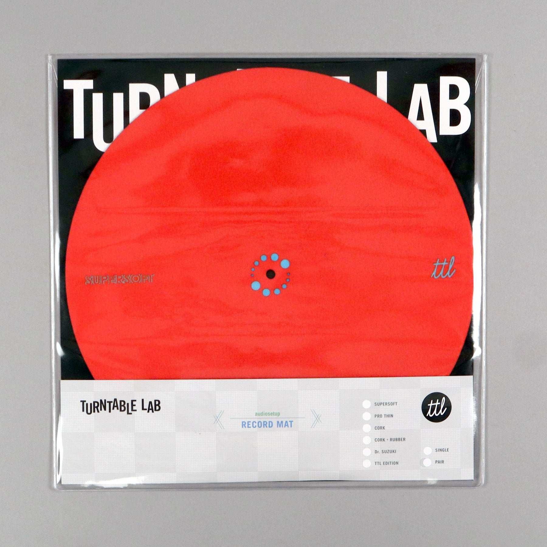 Reversible version of our bestselling slipmats! The Switchmat features a reversible design allowing you to easily switch up the look of your setup, while extending the life of the mats themselves. Available in black/white or red/blue with new 2024 Supersoft graphic on each side and comes in re-useable packaging. Turntable Lab Record Mats are made of the highest quality material + printed using advanced, non-abrasive inks.