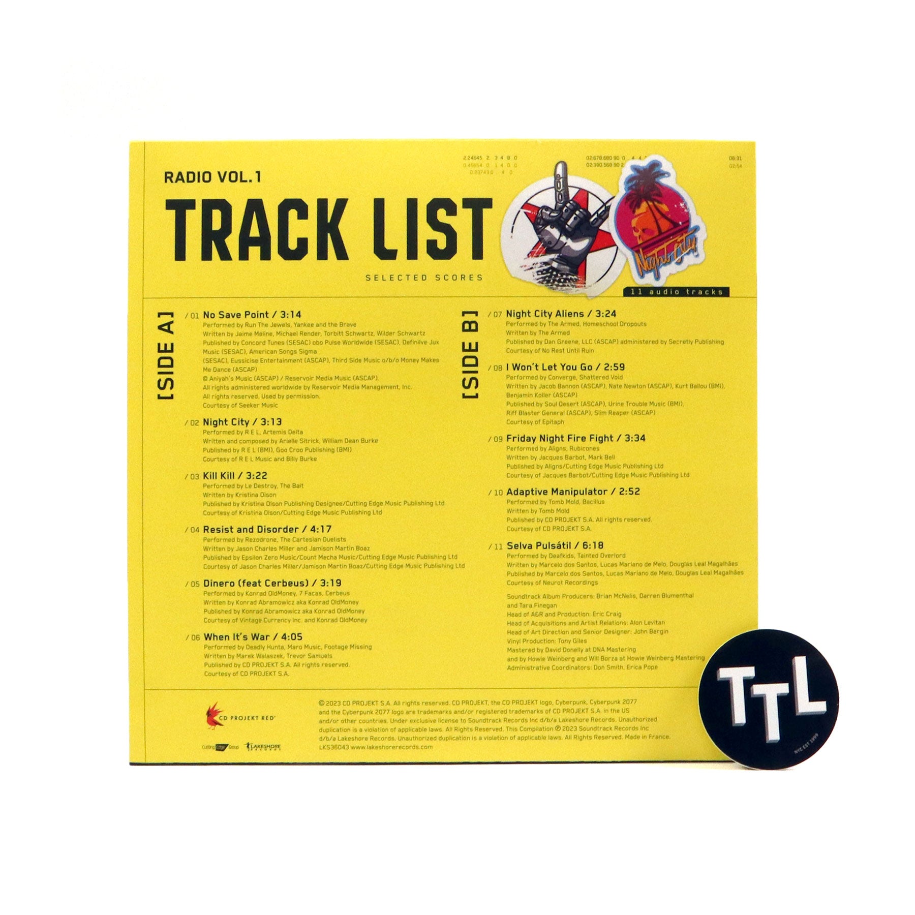 "Vol 1 of the soundtrack to CDPR game Cyberpunk 2077 on opaque yellow vinyl. Cyberpunk 2077 is a role-playing video game developed and published by CD Projekt Red. Adapted from the Cyberpunk franchise, the story takes place in dystopian Night City, an open world with six distinct regions. Players assume the first-person perspective of a customizable mercenary called V, who can acquire skills in hacking and machinery, an arsenal of ranged weapons, and options for melee combat. Volume 1 Features: Night City Aliens (The Armed) and Friday Night Fire Fight (Aligns) from Cyberpunk Edgerunners, the Netflix tv series, also includes tracks by: Run The Jewels, Converge, R E L, Le Destroy, Konrad OldMoney, Tomb Mold and others." - Lakeshore Records