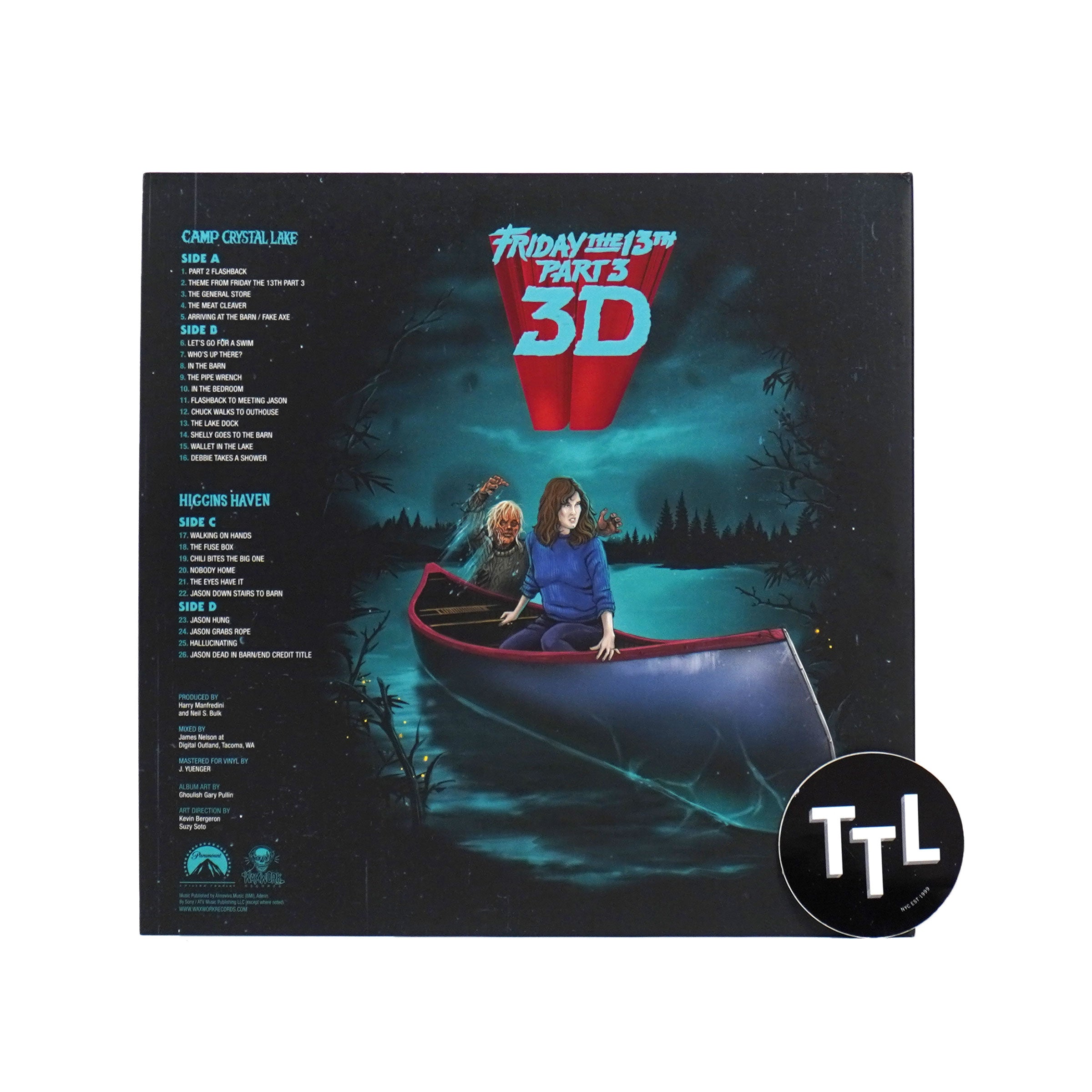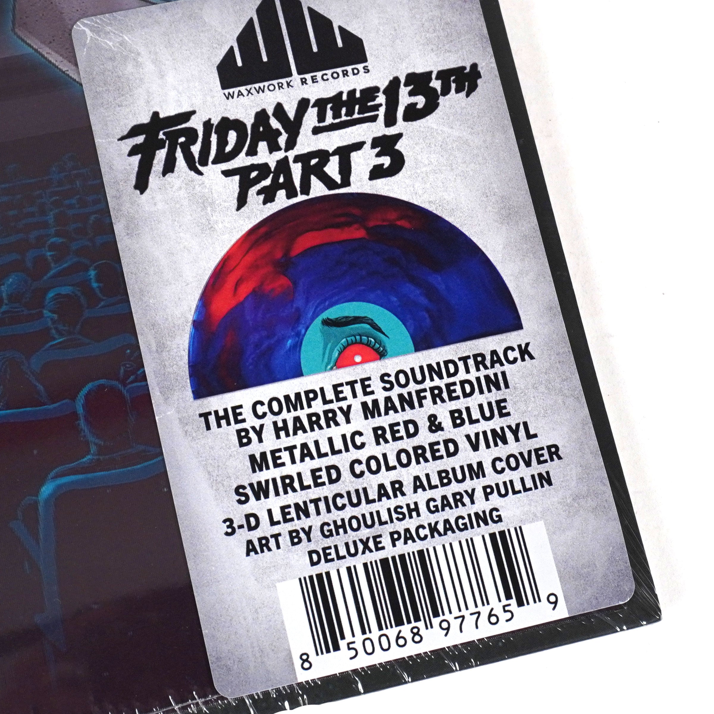 • "Waxwork Records is proud to announce the next entry into their collection of FRIDAY THE 13TH soundtrack releases on vinyl, FRIDAY THE 13TH PART 3. Waxwork and composer Harry Manfredini re-visited the original analog tapes in an effort to faithfully master the complete soundtrack for vinyl. Originally released in 1982 and in 3-D, FRIDAY THE 13TH PART 3 is the first film to feature the legendary slasher, Jason Voorhees, wearing his signature hockey mask. This image of a machete wielding, hockey masked killer became the trademark for the franchise, as well as an iconic image in American cinema and horror films in general. To keep in tune with the original 3-D theatrical release of the film, Waxwork created a deluxe quality 3-D lenticular mounted album cover for the heavyweight old-style tip-on gatefold jacket which houses two LP's featuring the complete score. And yes, this soundtrack release includes the now famous "Disco Theme" from FRIDAY THE 13TH PART 3's opening credits! " - Waxwork Records