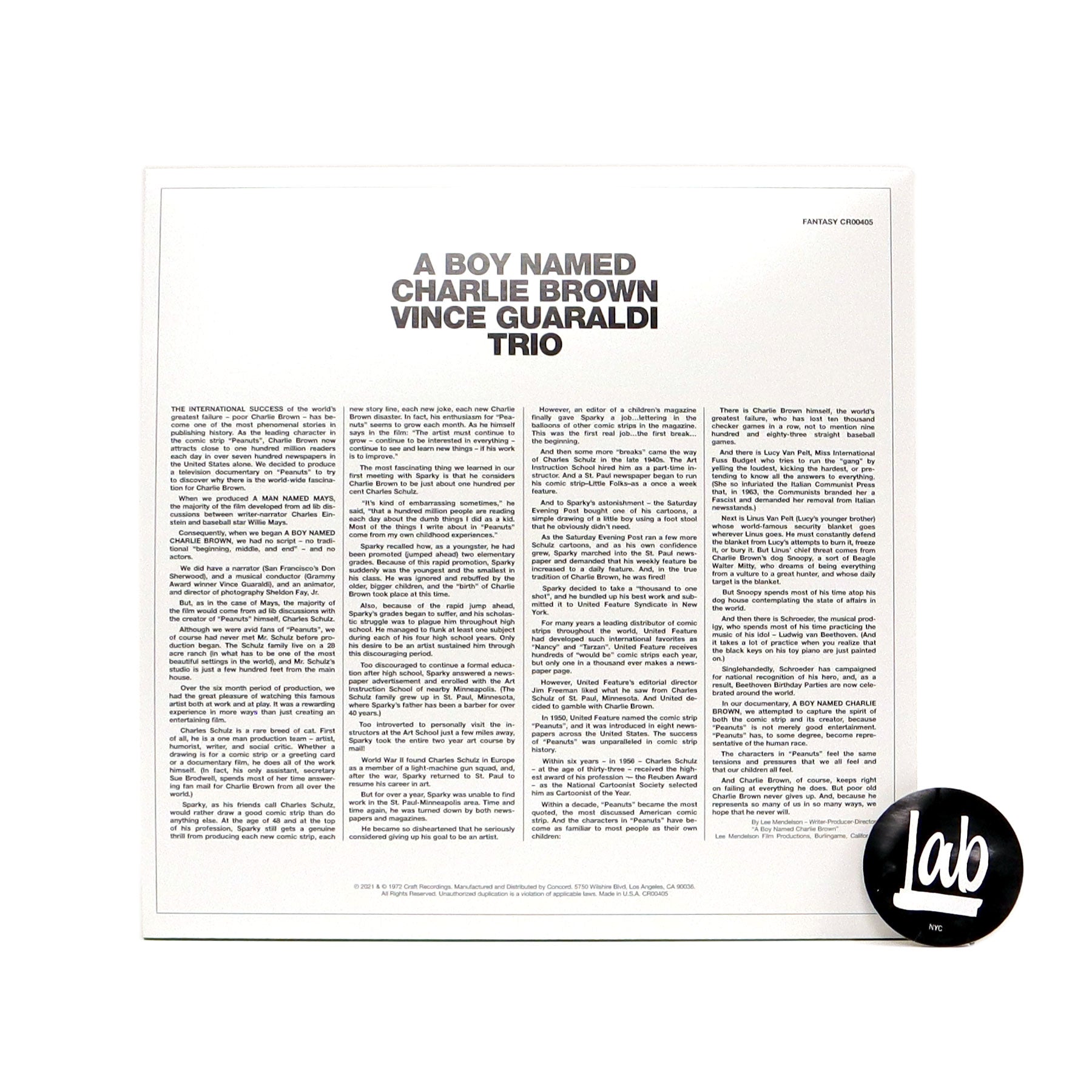 "Recorded in 1964, the music of A Boy Named Charlie Brown contains Vince Guaraldi’s earliest Peanuts creations, including the first appearance of 'Charlie Brown’s Theme' and 'Linus and Lucy,' which became the defining song of all the early TV specials. This LP re-issue features the 1972 artwork depicting a helpless Charlie Brown on a pitcher’s mound and comes with 8 newly created baseball cards of favorite Peanuts characters. The album was mastered from the original analog tapes by Kevin Gray." - Craft Recordings