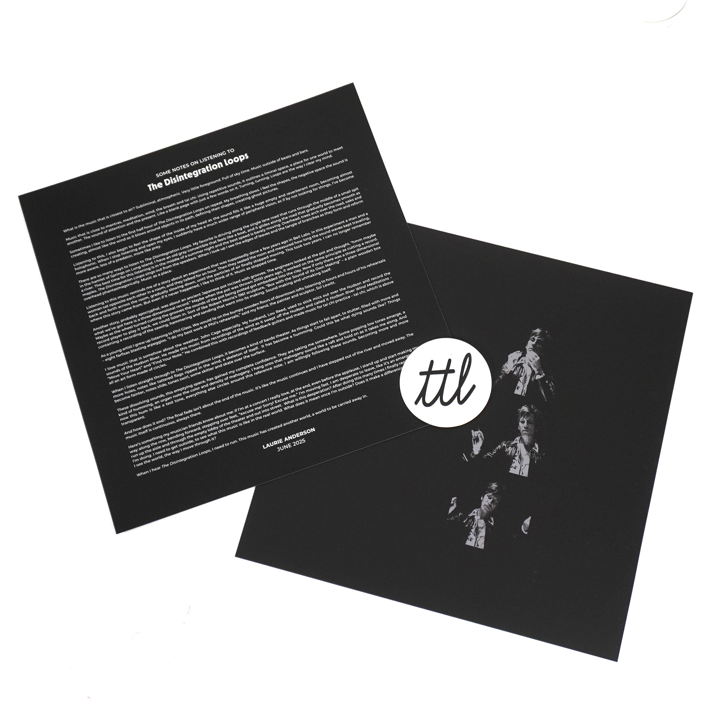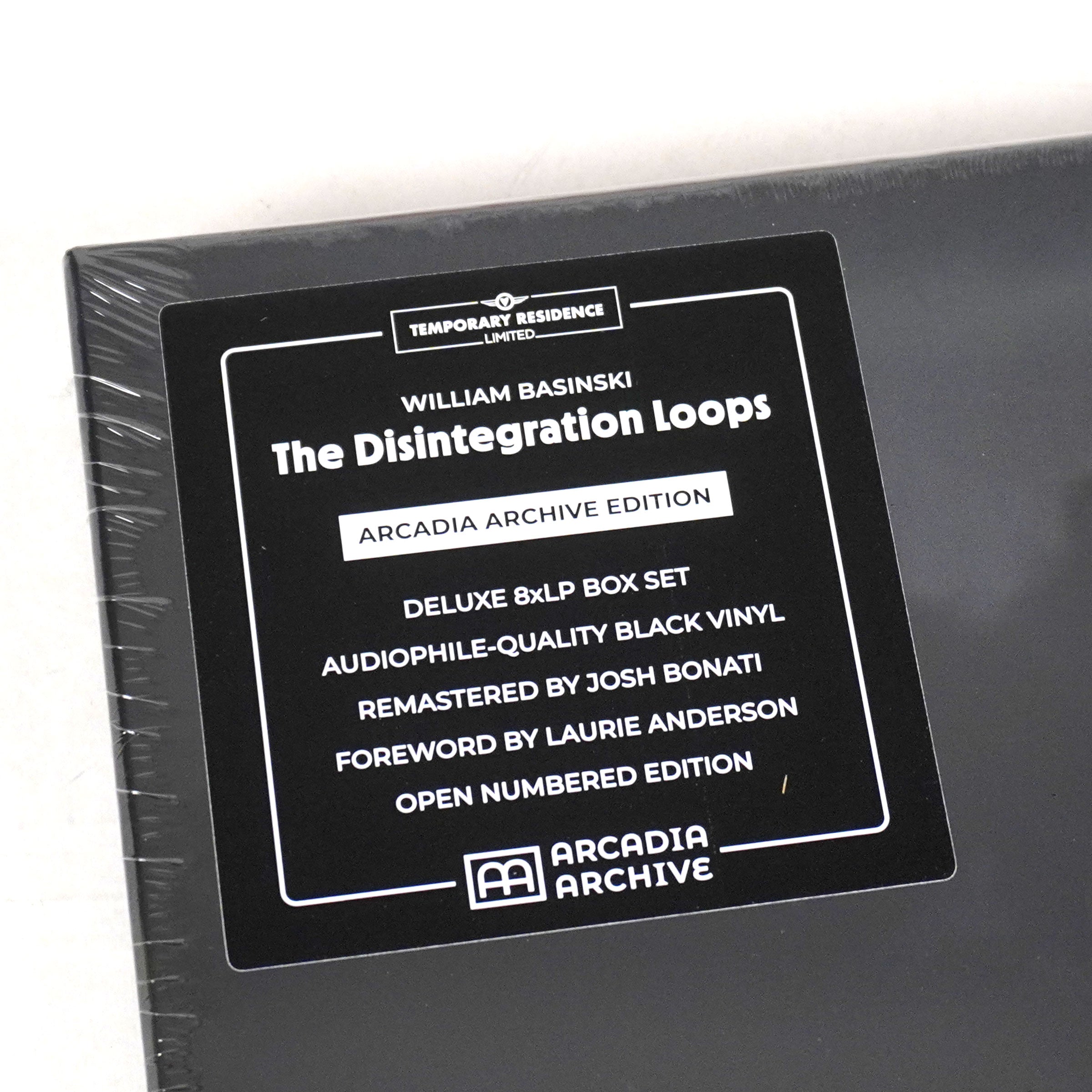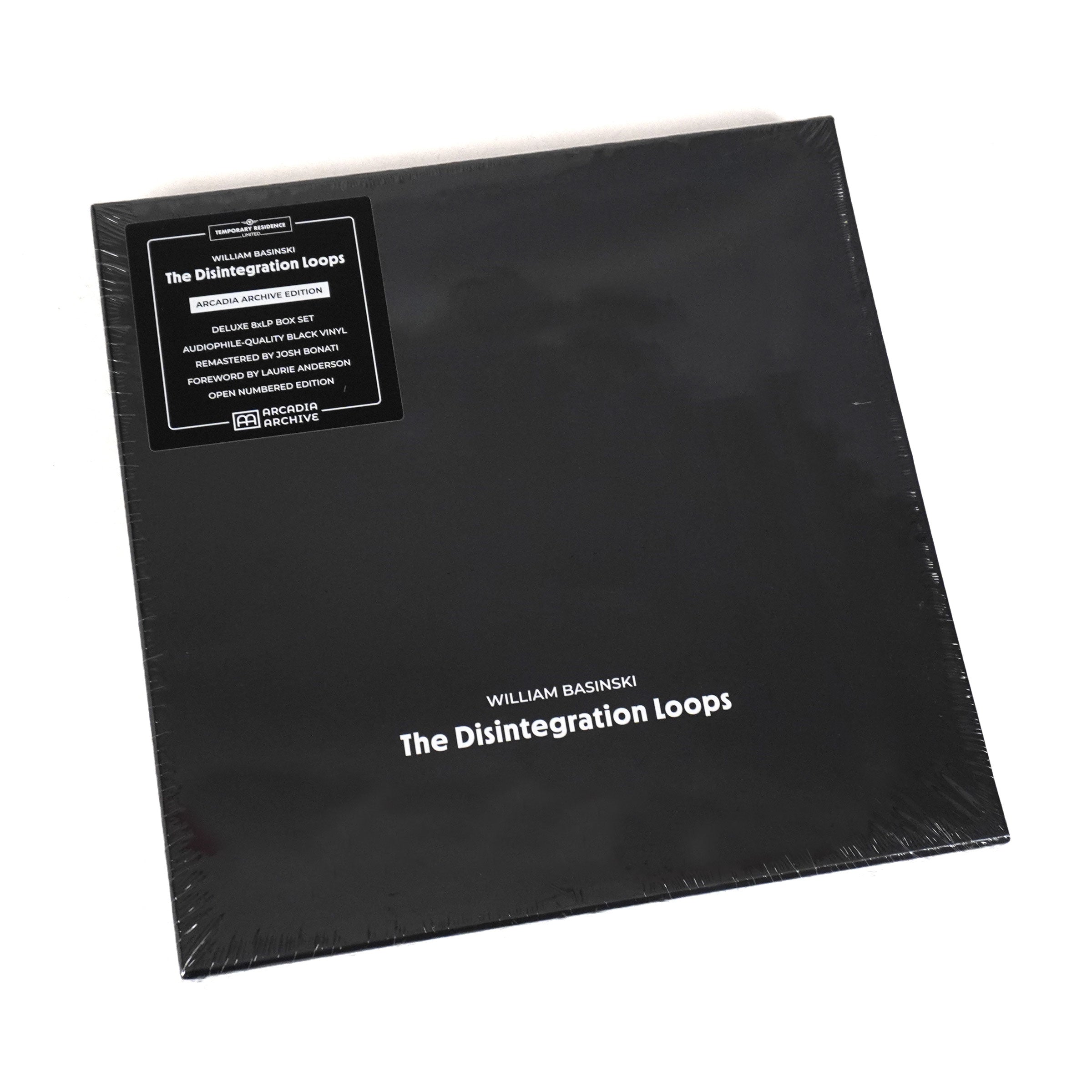 "Since the turn of this century, perhaps no other modern composition has had a more resonant healing effect than The Disintegration Loops. Composer William Basinski’s deteriorating analog tape loops evolved from melodic symphonies to melancholic silence over a span of time that uncannily turned passing minutes insive lifetimes. In her foreword for the new box set reissue of The Disintegration Loops, the pioneering multimedia storyteller, Laurie Anderson, describes the impact of this transformation in poetic detail: 'These dissolving sounds, this emptying space, has gained my complete confidence. They are taking me somewhere. I am willingly following these sounds, becoming more and more transparent.' The Disintegration Loops – Arcadia Archive Edition is an expansive new box set that includes the entire 5-hour suite of iconic work. Newly remastered from the original recordings by Josh Bonati, the hefty package includes eight vinyl records in sturdy full-color jackets featuring the restored original artwork, and a new 1000-word foreword by Laurie Anderson – all housed in a striking heavyweight, case-wrapped box." - Temporary Residence Ltd.