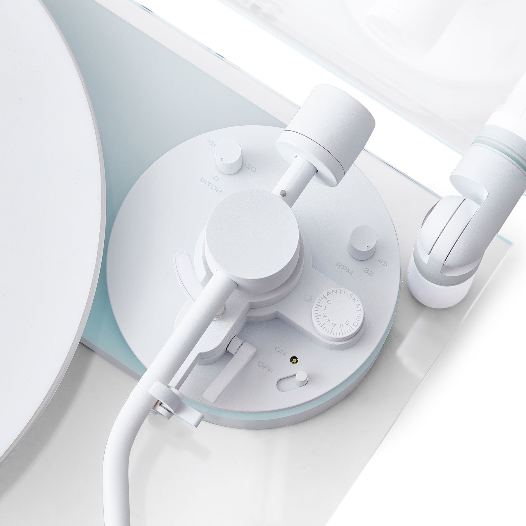 - S-shaped tonearm with headshell, adjustable counterweight, anti-skating control