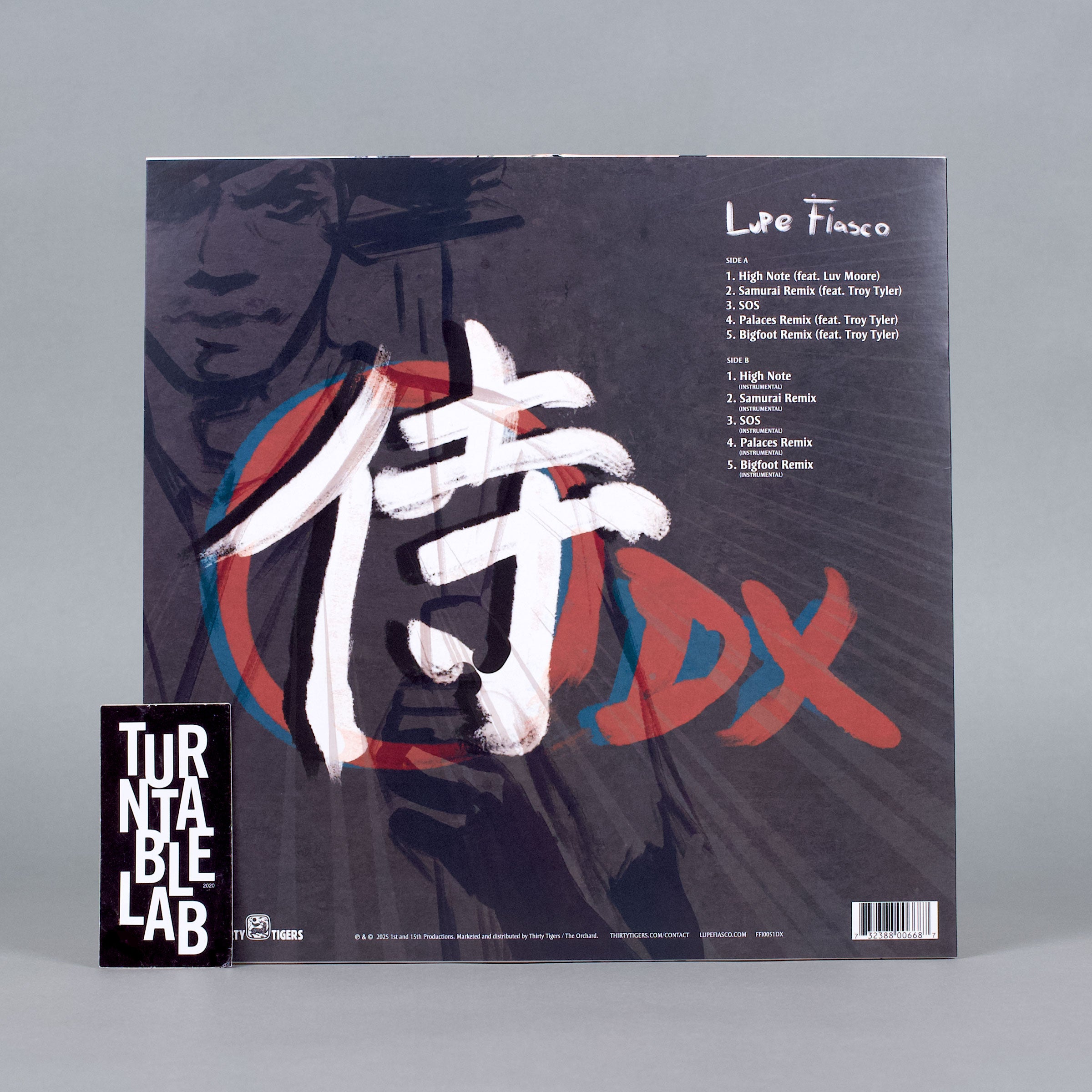 "Inspired by the life and work of Amy Winehouse, Lupe Fiasco’s Samurai proved the veteran rapper’s unparalleled ability to pen deeply conceptual rhymes without sacrificing soul. Produced in full by longtime collaborator Soundtrakk, the 8 song project earned widespread critical acclaim for its cerebral lyricism and warm sonic palette. On June 27th, the one-year anniversary of Samurai, Lupe unveils Samurai DX, offering two new Soundtrakk-produced songs from the Samurai sessions, 'SOS' and 'High Note,' plus remixes to original album highlights 'Samurai,' 'Palaces,' and 'Bigfoot' (now featuring a hook sung by singer-songwriter Troy Tyler). In addition, the vinyl release of Samurai DX offers instrumental versions of all five songs. Continuing the story of what Lupe Fiasco calls one of his 'most personal projects to date,' Samurai DX is another formidable document in the career of one of Chicago’s greatest emcees." - Thirty Tigers