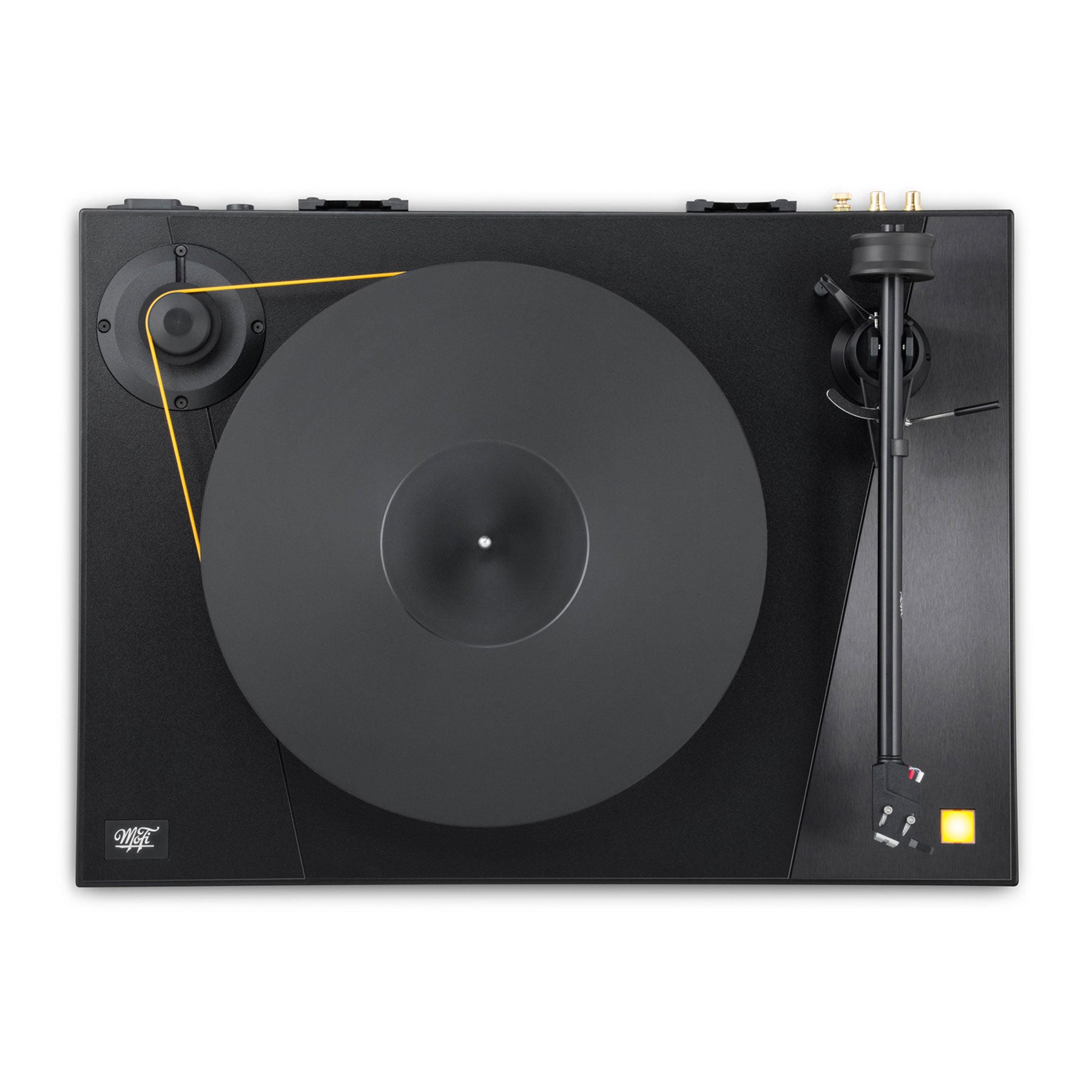 - advanced dampening body design w/ (3) aluminum plates bonded to MDF base for added mass (23.1 lbs); decouples the motor from the rest of the turntable