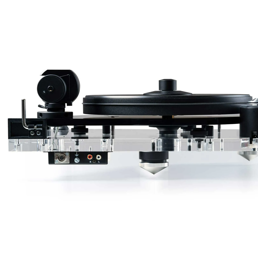 "Pro-ject's 6 PerspeX SB turntable delivers high end sound and functionality with stunning good looks. The acrylic plinth is the first thing you notice, a unique detail that is visibly appealing, that stands on three height adjustable TPE damped aluminum cones. The Corian sub-chassis rests on three magnetic fields that create a suspension system that avoids parasitic noise normally caused by con-ventional spring mechanisms. The resonance-optimized sandwich construction of the platter (a combination of MDF and vinyl layer + screw down record clamp) runs on an inverted bearing with stainless-steel axle carrying a ceramic ball/plate bearing. The pre-mounted 9" carbon fiber Pro-Ject 9cc Evolution tonearm rounds out this premium system. Comes complete with dustcover, counterweights, top grade RCA connection cable (Pro-Ject Connect It E), and pre-mounted Pick It MC3 cartridge." - TTL