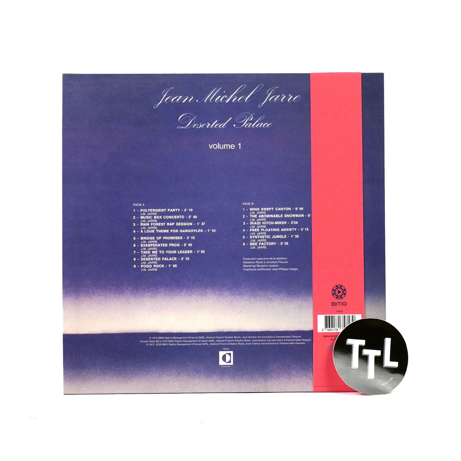 "Transversales Disques proudly presents the first official LP reissue of Deserted Palace, studio album written & performed by Jean Michel Jarre in 1972, during his work experience at G.R.M. (Groupe de Recherches Musicales). In 1971, an order was placed with producer Francis Dreyfus to provide sound for public places such as airports and libraries. He decided to pass the project on to Jean-Michel, who had recently been signed by his record company. These fifteen tracks are made with only two synthesizers (EMS VCS3 & Farfisa organ) in an experimental and very minimal style. 'It was a crazy album, totally homemade, with rhythms that I made in my student room, with a minimum of equipment and at the same time electronic sounds that I stole from the GRM where I went at night after stealing the keys to the studios. It is a pirate record, in every sense of the word, in which we find what I did afterwards.'" - Transversales Disques