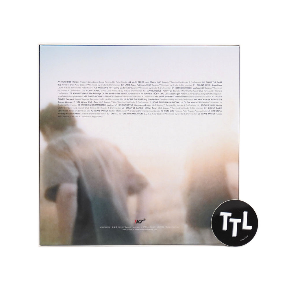 • Classic classic classic material! It's hard to believe that this is the first time that Kruder & Dorfmeister's genre defining K&D Sessions has ever been repressed on vinyl. This is one of those mixes that you could practically break your CD player with. The 1998 release collected original tracks, dubs and remixes by Peter Kruder and Richard Dorfmeister, presented in expertly mixed fashion. The overall vibe is bass heavy and downbeat, but there is a wide variety of material to dig into. The whole thing is an exquisite listen from end to end, so good that you'll want to restart it from the top once it's finished. It's a mix that I definitely spent a good amount of time with a little while after it first came out. And it all comes back to me, from the start of Kruder's Long Loose Bossa mix of Roni Size's "Heroes," to getting a little annoyed with Justin Warfield's corniness on the Bomb The Bass track, the one two punch of the K&D Sessions of the Rockers Hi-Fi cut and Depeche Mode's "Useless" (anyone wanna send ya boy the UK pressing of that 12"?). There's so much more to get into and it's well worth the price of admission. Excellent after hours material. Recommended.