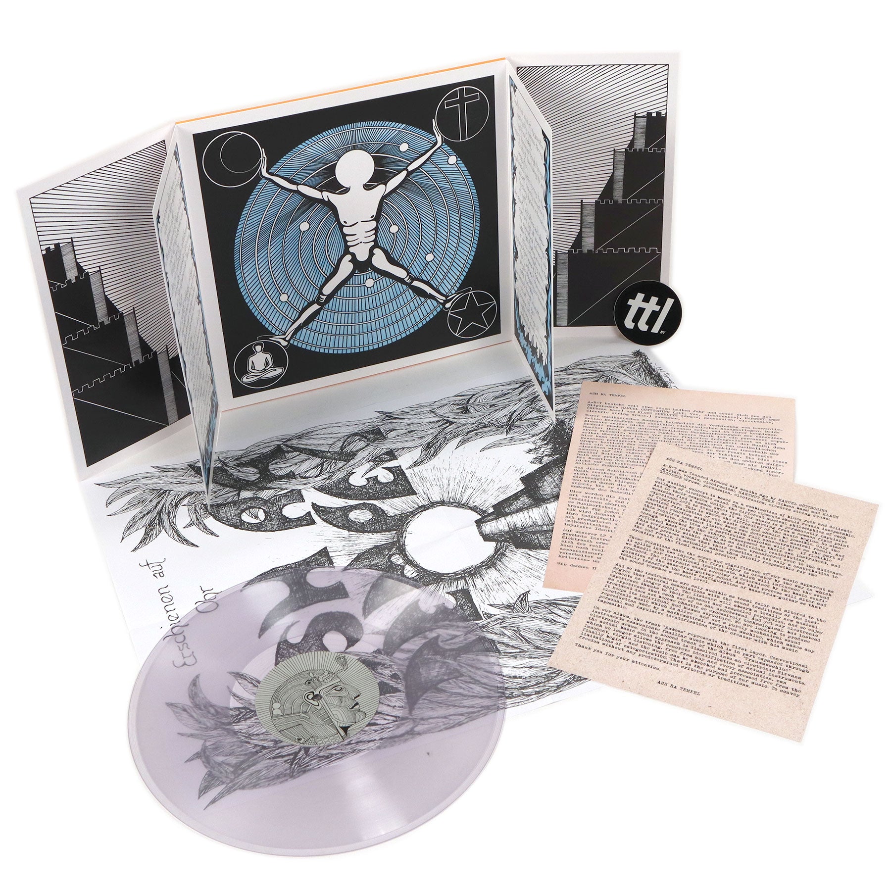 "Transparent vinyl version. First-ever official reissue on vinyl since 1975. Ash Ra Tempel is the eponymous debut studio album by the Krautrock band Ash Ra Tempel. It features guitarist Manuel Göttsching with drummer Klaus Schulze and bassist Hartmut Enke. Engineered by Conny Plank, it was recorded in March and June 1971 on Ohr Records. This 50th Anniversary Album will be released in memoriam of all the musical contributors to this release and on Manuel Göttsching's MG.ART label. 50th Anniversary RE-Edition, Re-Cut carefully overseen by Manuel Göttsching. 350 gram Quadro Fold Out Sleeve that exactly replicates complex/original OHR die-cut jacket, A2 Poster, 2x (German and English) A4 Inlay with Original Bio Sheet written by Manuel Göttsching (1970). Pressed at Optimal, Germany." - MG.ART