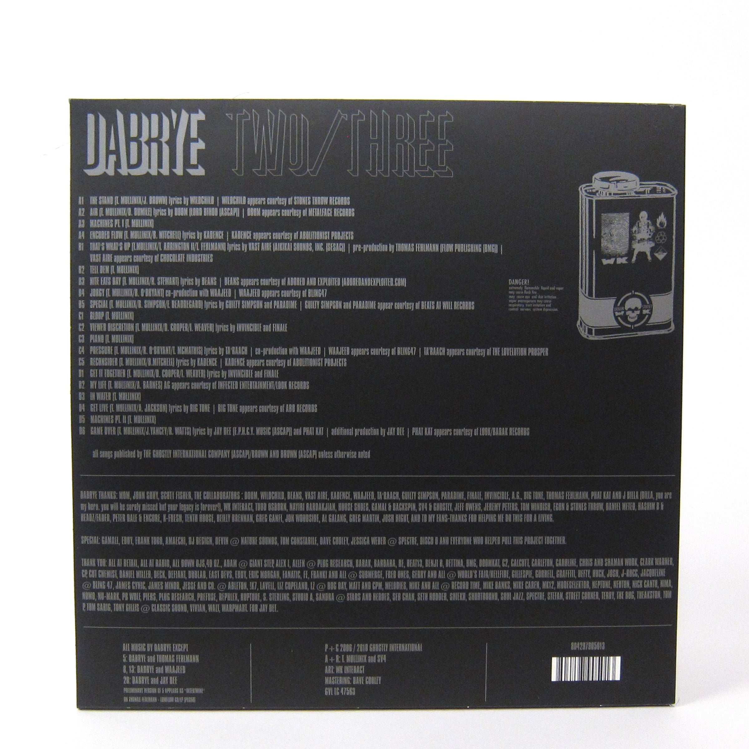 2001's One/Three was followed in 2002 by Instrmntl, and the two albums established Tadd Mullinix aka Dabrye as a formidable beatsmith. Mullinix's Detroit-filtered hip-hop-meets-electronica style quickly placed him alongside bing names like Prefuse 73, and fellow producers like the late J Dilla would become fans of his work. For Two/Three, Dabrye makes "the statement he'd always intended," and that he does so by enlisting a solid roster of local and national rap talent. Listen to J Dilla, MF Doom, Vast Aire, and Guilty Simpson over some of the most innovative (still true today) soundscapes from a forefather to the looming beat scene. Here's the og Lab review: "Here he comes with his most hip-hop weighted effort yet with a 20-track album consisting of roughly two-thirds emcee tracks. Let's start off with the instrumentals. Beathead fans of previous Dabrye work will be snapping necks to tracks like the Detroit collaborations "Jorgy" featuring Wajeed, the underwater sounding "Bloop," the retarded basslines of "Piano," and Terminator-esque science fiction theme of "Machines Pt.1." As for the vocal tracks, this is some grimy underground shit. If you're not up on your Dabrye 12"s, here's a chance to catch up with two of his finer collaborations: "Air" featuring MF Doom and "Game Over" featuring Jay Dee. Lots of album only nuggets, too, check out "Pressure" featuring Taraach and "Special" featuring Guilty Simpson and Paradime. Additional emcees included: Wildchild, Vast Aire, Kadence, Beans, Invincible, Finale, AG, and others. Pretty impressive."