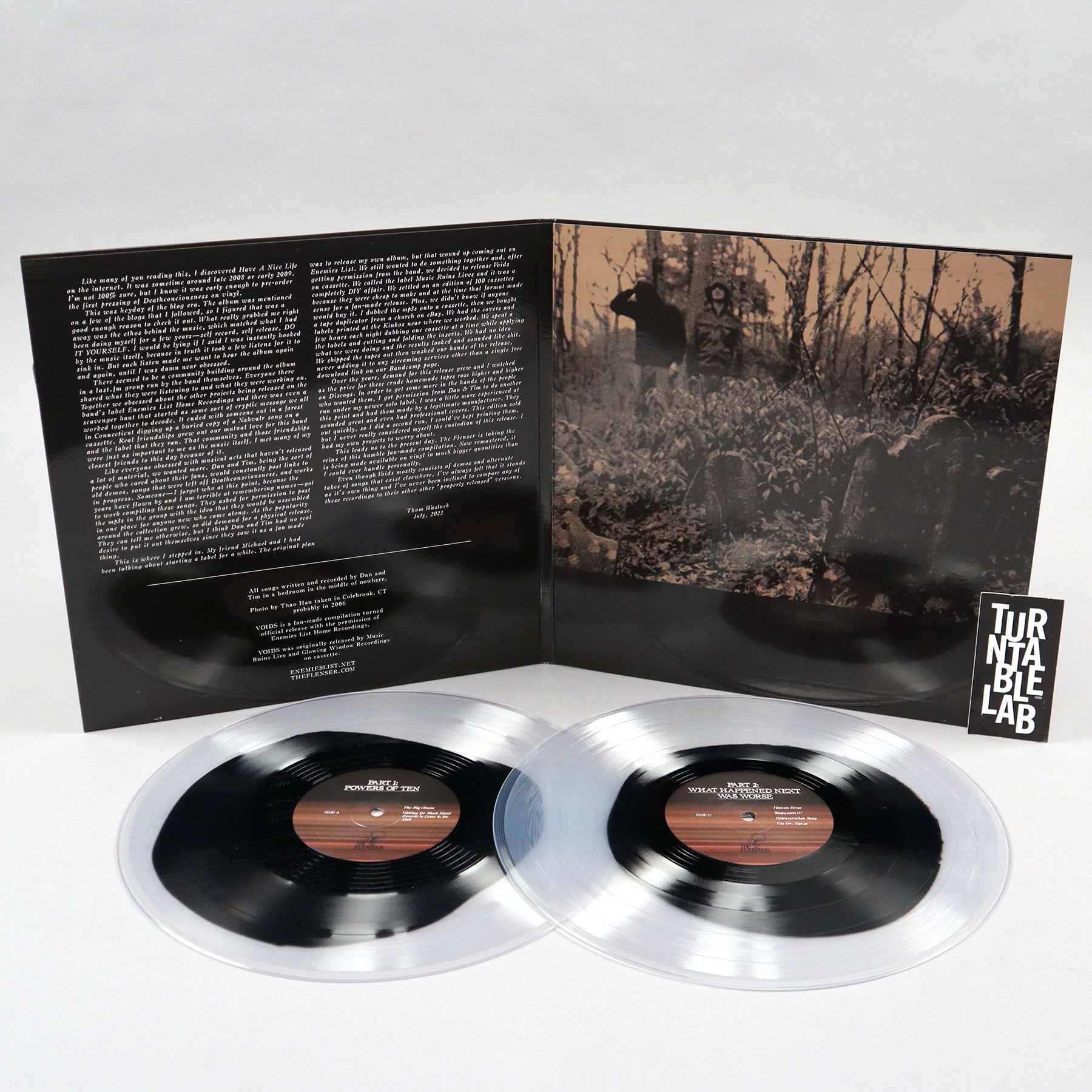 "Over a decade since its initial, unofficial release in 2011, The Flenser is proud to reissue Have a Nice Life’s Voids for the first time ever in an official capacity in physical form. Originally released digitally in early 2023 and freshly remastered for the occasion, this reissue of the beloved compilation of old demos, works in progress, and outtakes from the recording of Deathconsciousness will receive its first-ever wide release on physical format. This release also marks the first time fan-favorite tracks from Voids 'Sisyphus', 'I’m Doctor House', and 'Human Error' will be available on vinyl. Like a symbolic passing of the torch, the physical versions of the 2023 Voids reissue come with a foreword essay written by Wasluck, the previous custodian of Voids during the Music Ruins Lives days." - Flenser Records
