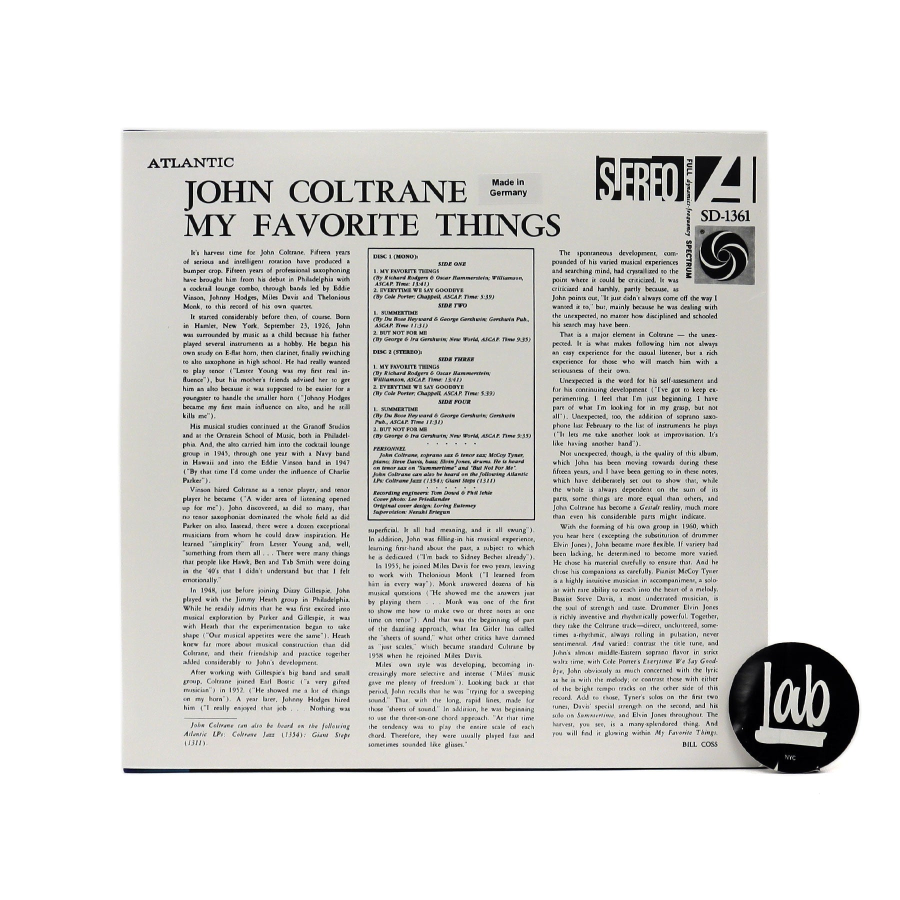 "Released in 1961, My Favorite Things made John Coltrane a star with box-office pull previously reserved for the likes of Dave Brubeck and Miles Davis. The dazzling quartet treatment of the Richard Rodgers hit song features Coltrane on soprano saxophone for the first time on record and became an instant hit single in its own right. The album also became a major commercial success, receiving the Grammy Hall of Fame award in 1998 and attaining gold record status in 2018. The recently uncovered mono version of this album-once believed to be lost forever-is included in this deluxe package along with the stereo version, both having been mastered from the original tapes. This 60th Anniversary deluxe edition also includes liner notes by award-winning writer Ben Ratliff, as well as photos and Atlantic Records ephemera." - Atlantic