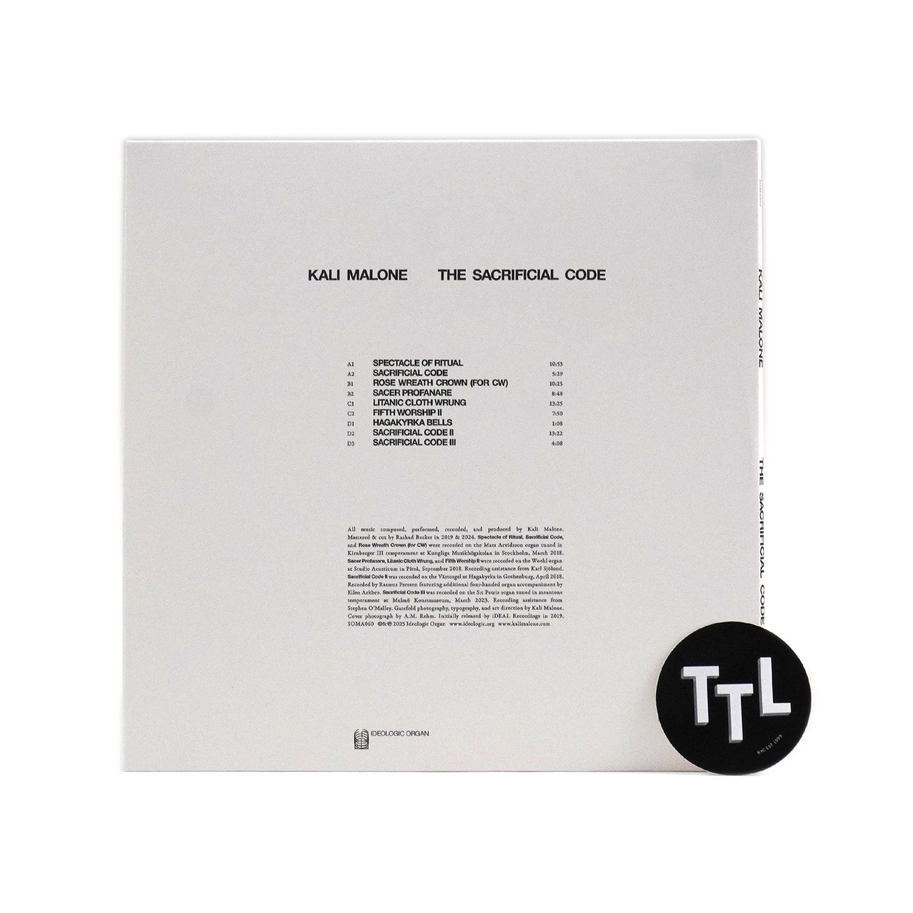 "Kali Malone’s The Sacrificial Code is the 2019 breakthrough album of the acclaimed composer’s pipe organ pieces. Her temporally informed studies of harmonics and intonation breathed life into a suite of compositions which leaves the heart moved and mind still. This 2025 edition was mastered by Rashad Becker and features a new track Sacrificial Code III." - Ideologic Organ