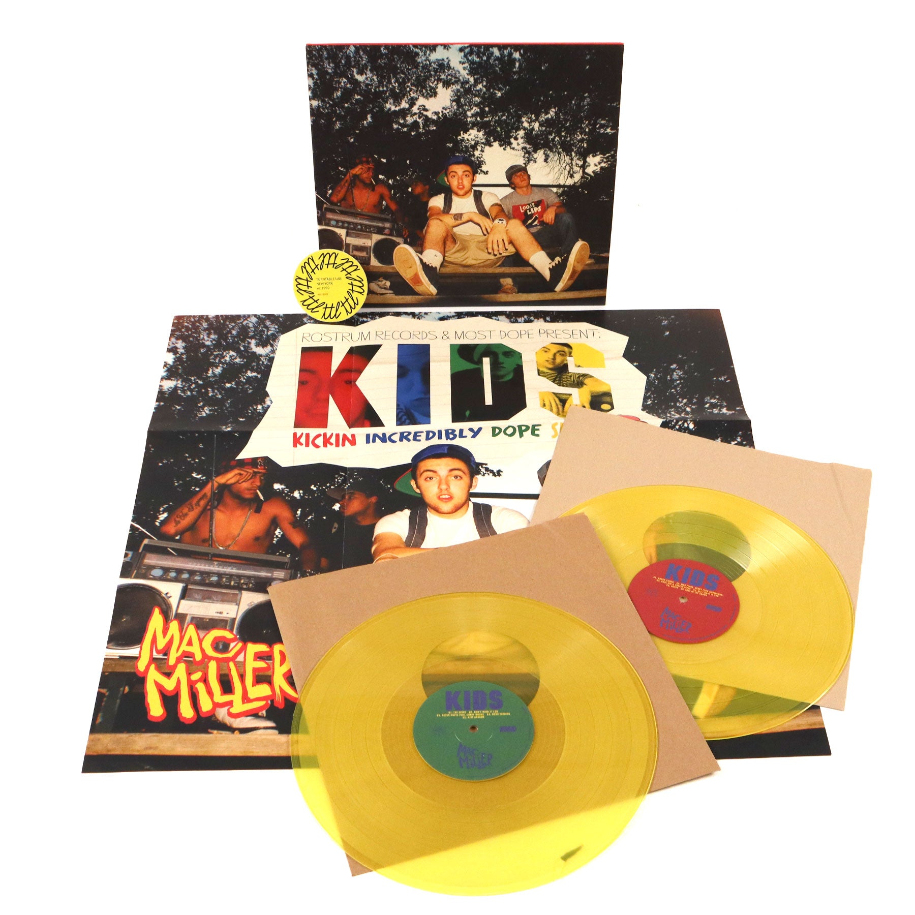 "Mac Miller's seminal mixtape K.I.D.S. was originally released in 2010 by Rostrum Records. Featuring the tracks, 'Nikes on My Feet,' 'Kool Aid & Frozen Pizza,' and 'Knock Knock,' Miller's first entry on the Billboard Hot 100. The title, an acronym for 'Kickin' Incredibly Dope Shit,' is a reference to the 1995 film, Kids, which is quoted throughout. Double LP set on limited edition translucent yellow vinyl." - Rostrum Records