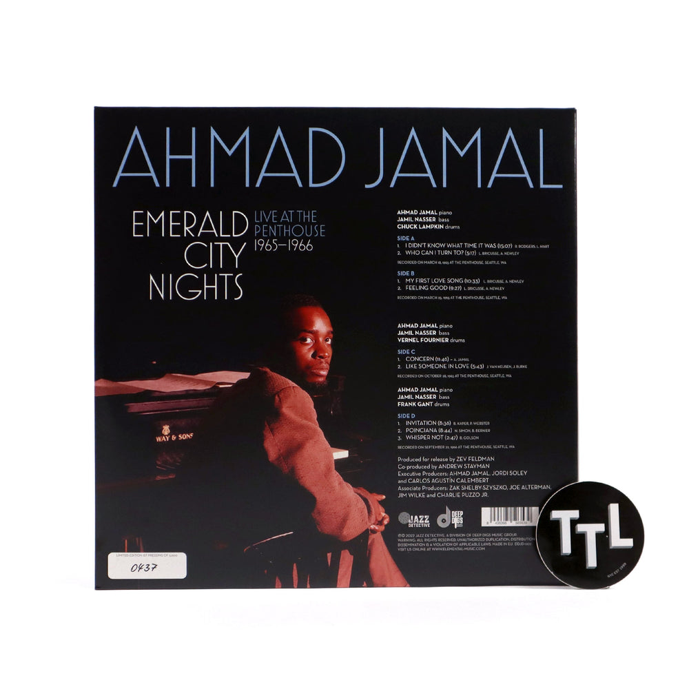 "Emerald City Nights: Live At The Penthouse (1965-1966), brings forth a collection of previously unreleased recordings of the iconic pianist Ahmad Jamal captured live at the hallowed Seattle jazz club. Featuring trios with bassists Richard Evans and Jamil Nasser, drummers Chuck Lampkin, Vernel Fournier and Frank Grant. Limited Edition 2 LP set on 180-gram vinyl with audio transferred from the original tape reels and mastered by the legendary Bernie Grundman. Includes extensive booklets with rare photos, liner notes by journalist Eugene Holly Jr. and interviews with pianists Ramsey Lewis, Jon Batiste, and Hiromi, producer Marshall Chess of Chess/Argo Records, and more. Volumes 1 and 2 mark the first releases from producer and 'Jazz Detective' Zev Feldman's new label venture, in partnership with Elemental Music." - Jazz Detective
