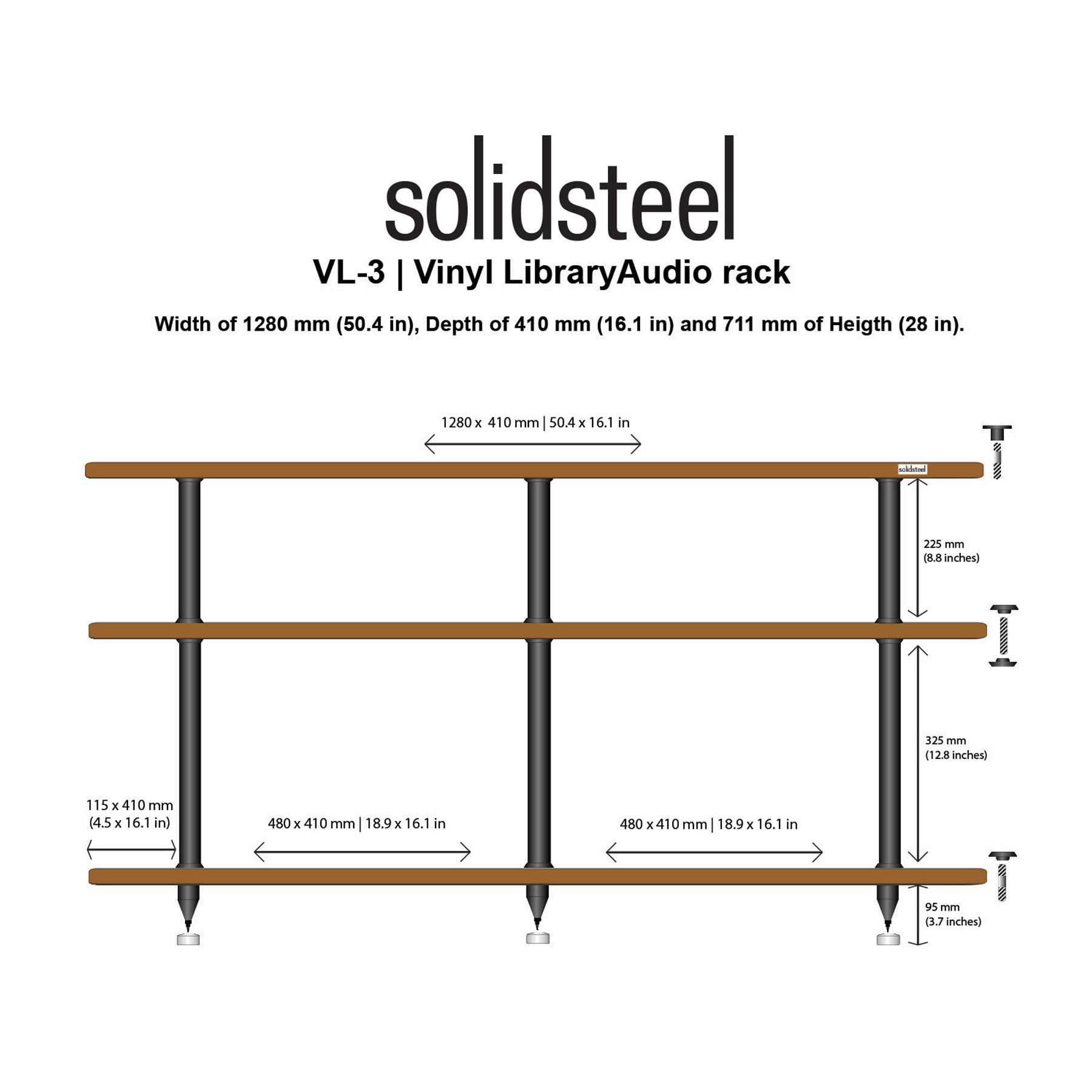 "Our production consists of furniture with available spaces distributed up to 4 shelves, but it is possible to add to each model further levels to satisfy even the most diverse needs. Do not forget that our racks are all modular. The only available distances between the VL shelves are 12.79" / 325 mm between the first and second shelf, and 8.85" / 225 mm for the subsequent shelves. The VL-3 rack is designed for essentially accommodating a record collection and a regular audio system (for example: a turntable, an integrated amplifier, a digital player, Streamer/DAC, with eventual bookshelf speakers on both sides). " - Solidsteel