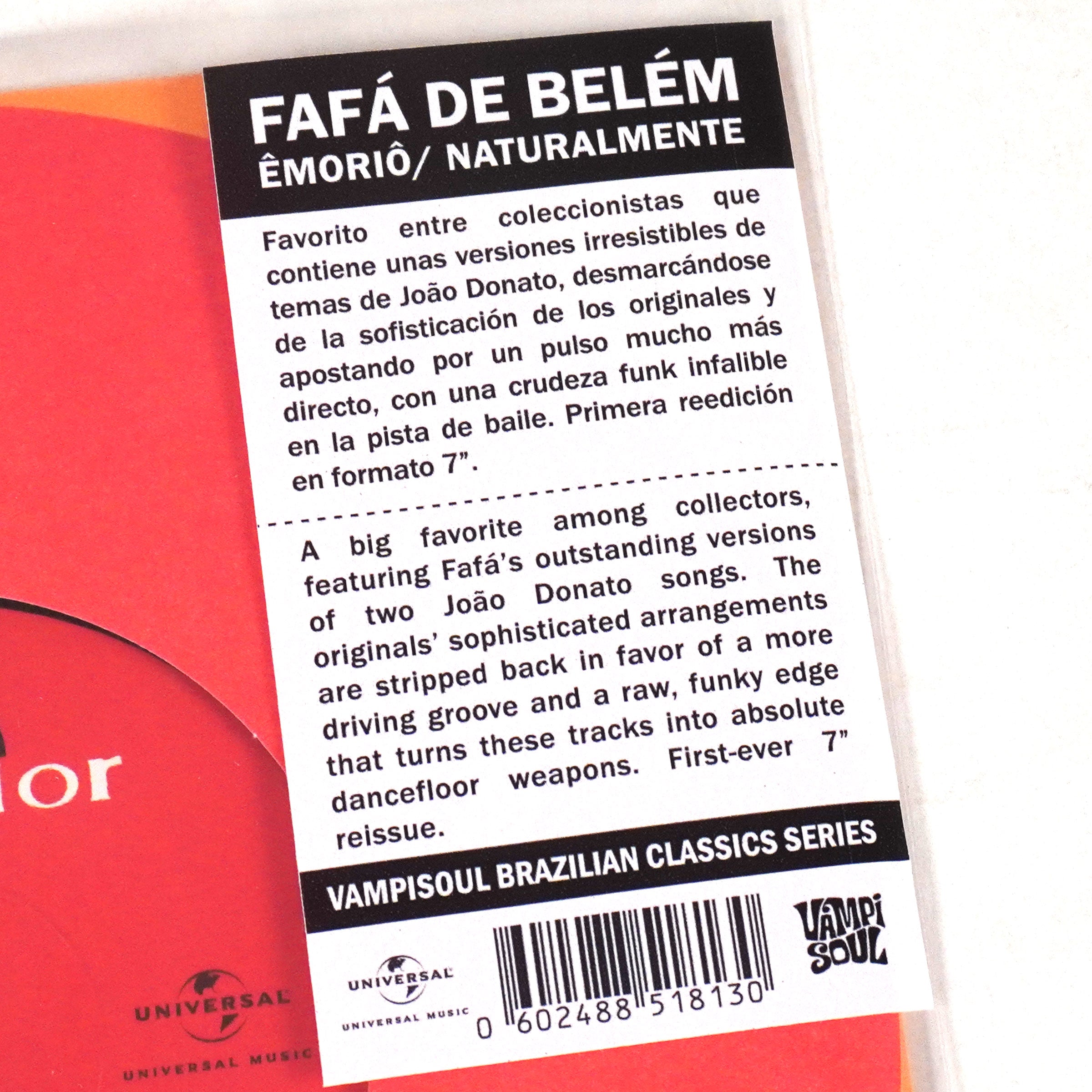 • "Singer and actress Fafá de Belém is one of Brazil's most beloved and popular artists. This vinyl single from 1975 marked the very beginning of her long and successful career in Brazilian popular music and, over the years, has become a highly sought-after collector's item among DJs worldwide. The record features two tracks, 'Êmoriô' and 'Naturalmente,' written by João Donato alongside Gilberto Gil and Caetano Veloso, originally released on his album Lugar Comum that same year. Fafá de Belém's versions, however, strip away the originals' sophisticated arrangements in favor of a more driving groove and a raw, funky edge that makes them absolute dancefloor weapons." - Vampi Soul