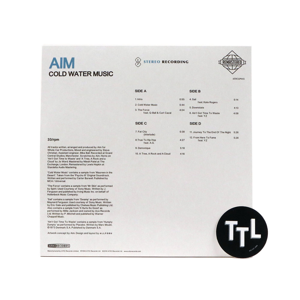"When Aim’s Cold Water Music debuted in 1999 it was an underground sensation. A game-changing collection of uplifting cinematic soundscapes, dark jazz fuelled breaks and hard hitting hip-hop beats featuring guest rap legends QNC, AG and YZ. The album went on to shift well over 100,000 physical units and is now seen as a ground-breaking, genre defining UK classic. Two decades on from it’s initial release Cold Water Music sounds as fresh, as inventive and as necessary as it ever did. Fully remastered from the original DAT tapes with revised artwork on 2 x 12″ 140g ice-blue wax…" - Atic Records