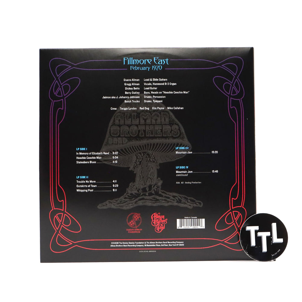 "Recorded over three nights in February 1970 when the Allman Brothers Band opened for the Grateful Dead for the first time, these shows were recorded by Owsley Stanley, the Dead's pioneering soundman, whose 'Sonic Journal' recordings are sought after for their purity and uncanny ability to place the listener in the venue. This is essential listening for Allman Brothers Band fans, showcasing an early incarnation of the band with Duane Allman in full form and featuring the earliest known live concert recording of 'In Memory of Elizabeth Reed', which had just been penned by Dickey Betts shortly before these shows. The tapes were recorded just one year before the band's landmark At Fillmore East album from the same venue. Long out-of-print, this set was freshly restored and mastered from original tapes in Owsley Stanley's archives, and includes all new album art and liner notes, including a series of rare band photos from the Fillmore East in February 1970, original cover artwork ('Electric Mushroom'), and new notes from the Allman Brothers Band and the Owsley Stanley Foundation. This is the second release in the award-winning 'Bear's Sonic Journals' series and the first joint presentation by the Allman Brothers Band and the Owsley Stanley Foundation." - The Allman Brothers Band Recording Company