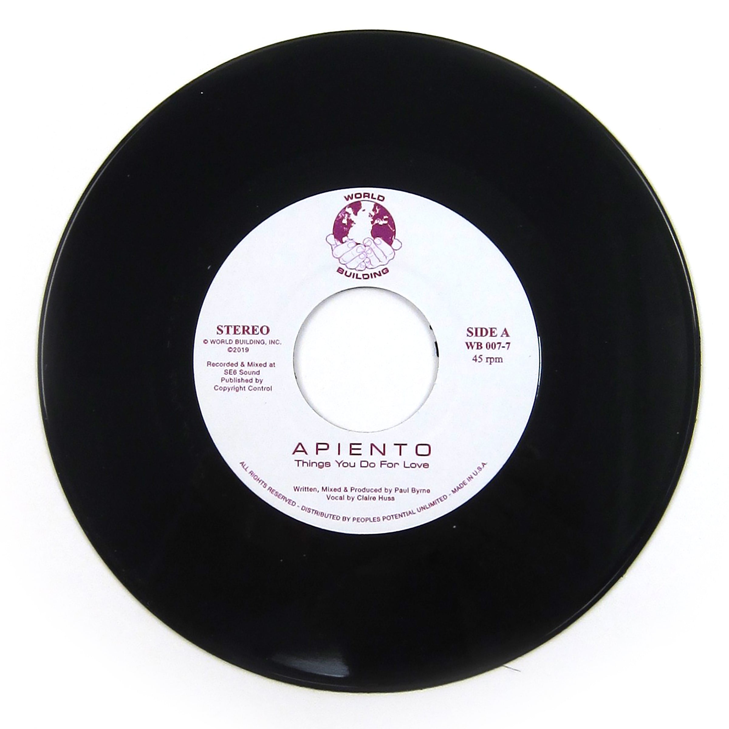 bite-sized Balearic bliss. "Things You Do For Love" is the first solo release from Apiento, head of record label and clothing brand Test Pressing. Straddling the boundaries of soothing deep house, glitchy IDM, and the more melodic side of techno, this tune takes vocal inspiration from the Lil' Louis classic "French Kiss", but less X-Rated. The flip features the 'Heartbeat' version, which throbs closer to Art Of Noise territory. Pressed on a 7" single, this one needs a 45 adapter.
