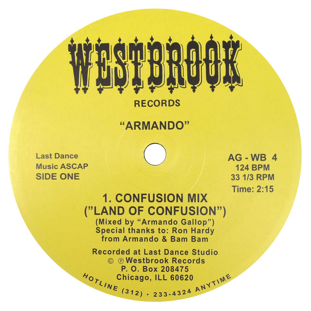 Crucial acid repress. Armando's "Land Of Confusion" is the blueprint for acid house with its punishing 303 bassline and pounding drum programming. The track still bangs next to contemporary releases and its influence is certainly felt almost 30 years after the fact. Includes the original Confusion mix, plus two raw, stripped down drum tracks (Confusion Track 1 and 2). Pressed in the original Westbrook configuration with convincing labels. Bang the box!
