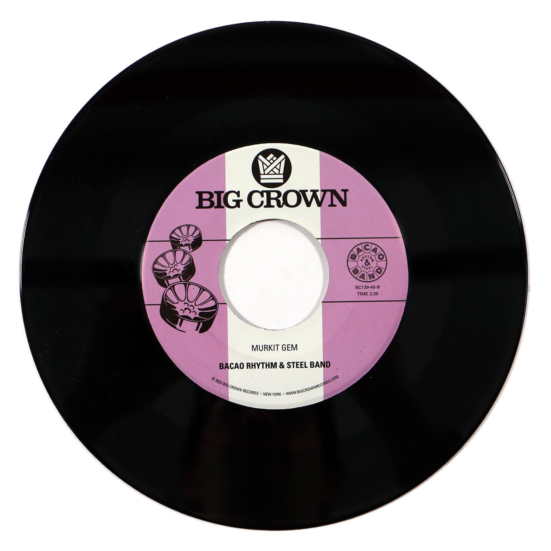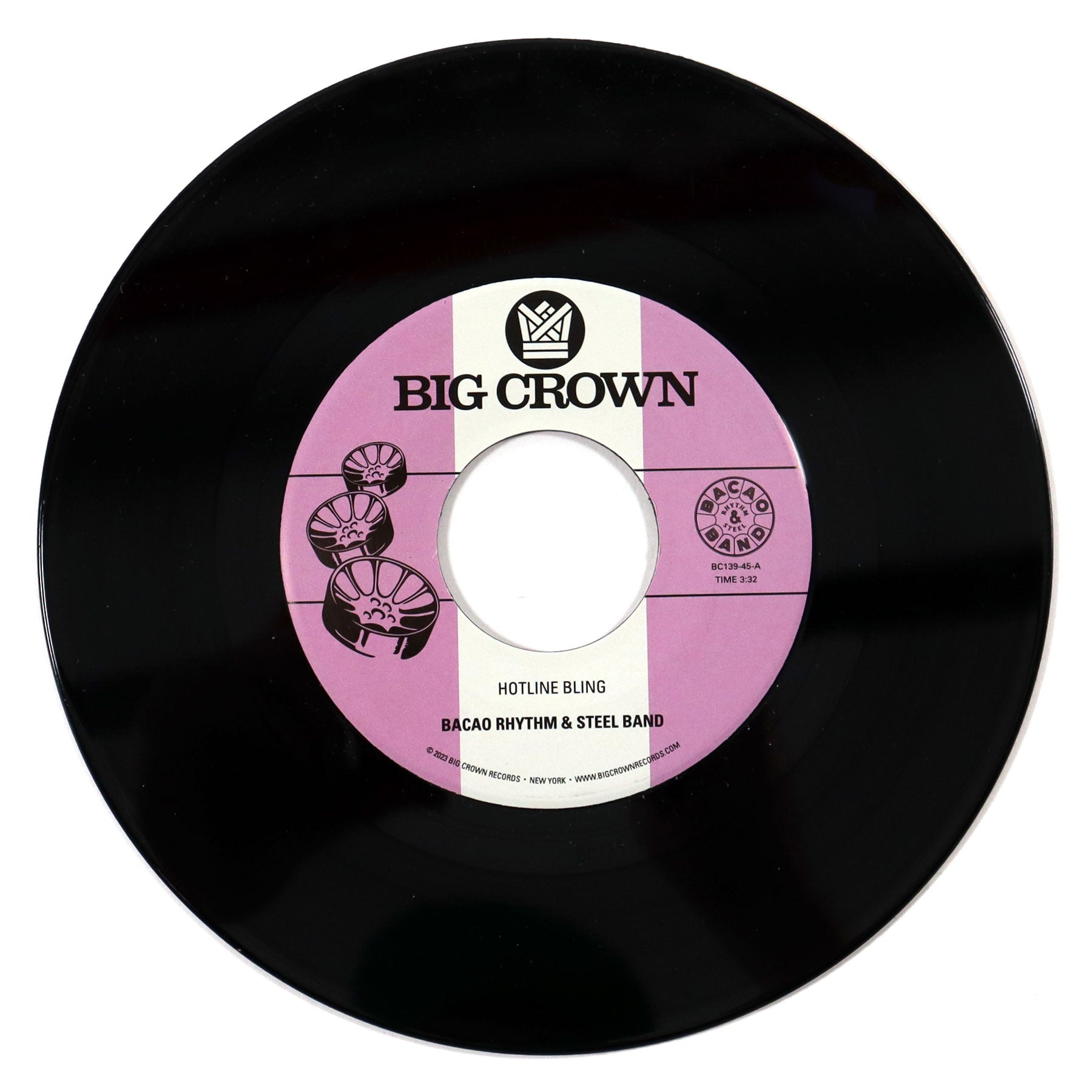 "Bacao Rhythm & Steel Band return with another set of covers bound to get you out of your seat and on your feet. The mysterious German steel pan outfit is working on their fourth studio album now and treat us to another must have two-sider to hold us over while they finish it. This one is sure to become another favorite among DJs worldwide.The A side finds BRSB taking on a huge hit with an eerie cover of Drake's 'Hotline Bling.' The intro melodica hints at the melody and when the beat drops and the top line plays on the pans all bets are off. The B side is something of a Big Crown family affair as Bacao covers 'Murkit Gem' from El Michels Affair's Yeti Season album. The tune lends itself to the pans with its infectious melodies and the way BRSB plays it, it takes on a James Bond spy chase energy that works perfectly." - Big Crown Records