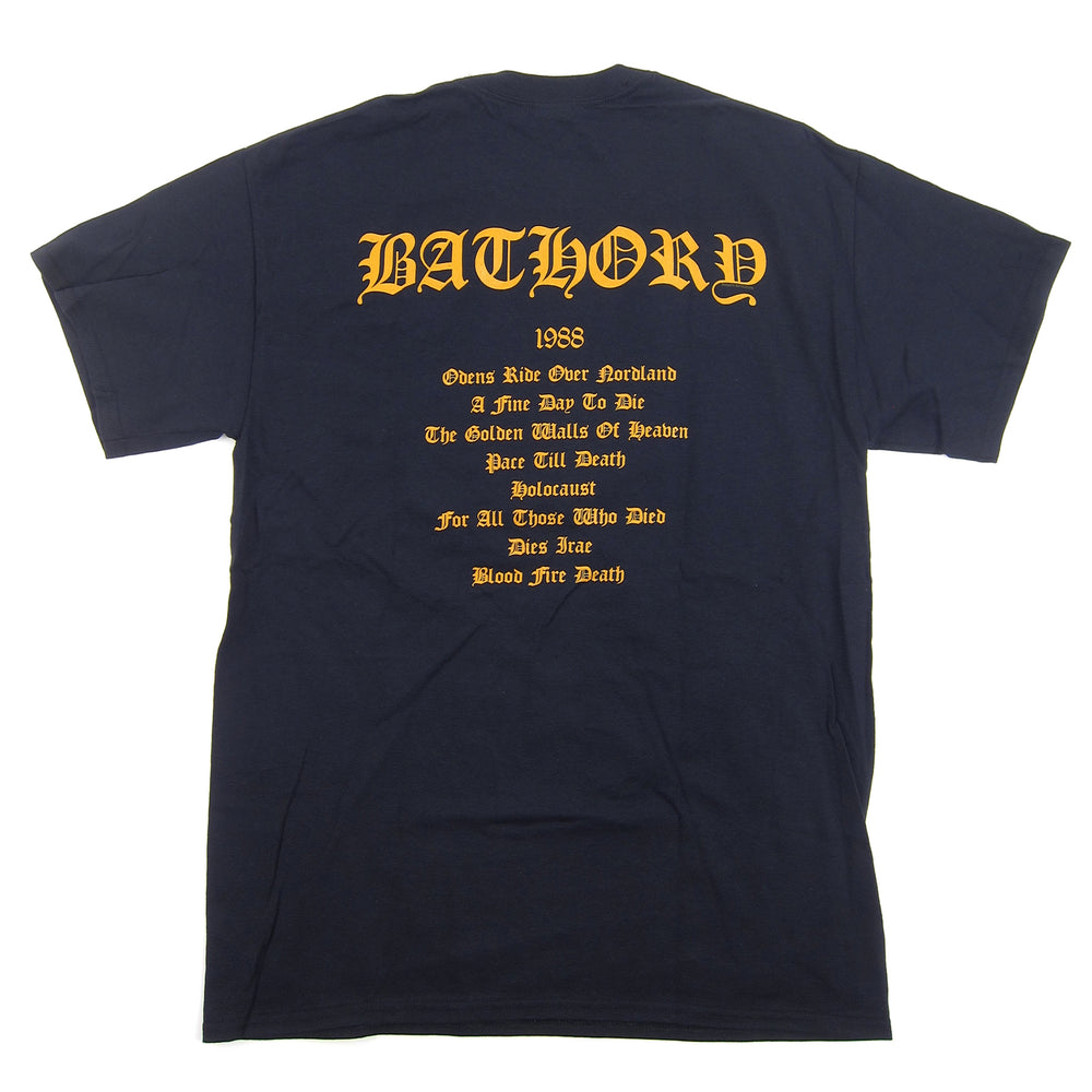 Now choose your weapons, and fall in the line. Official Bathory shirt featuring artwork from the Swedish band's 4th album. Blood Fire Death was originally released in 1988 and is widely considered a black metal classic. Double sided print with artwork on the front and tracklist written out on the back. Printed on all cotton, standard fit tees.