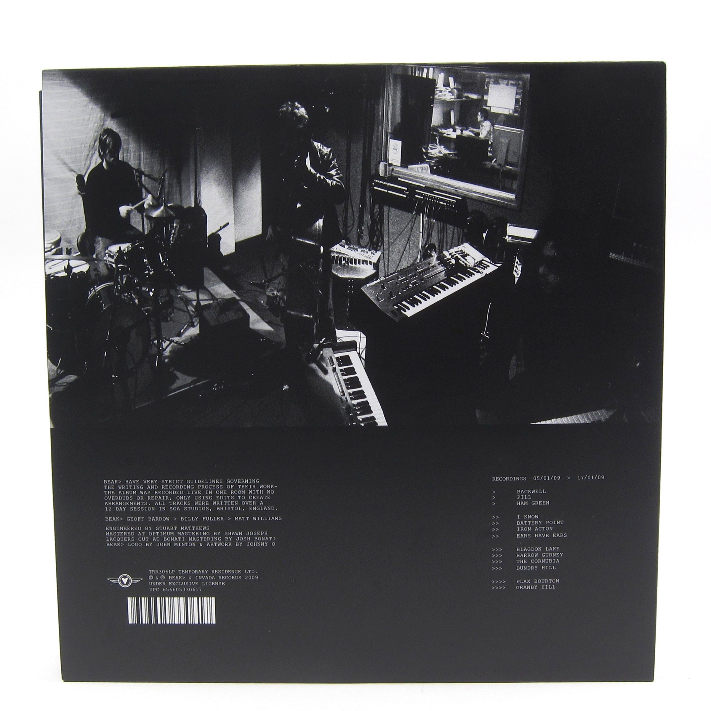 Debut full-length, remastered and repressed! Geoff Barrow had long bemoaned the gross misinterpretation of Portishead’s music as fondue background music, and by the time he settled down with William Fuller and Matt Williams to form Beak>, he had a lot to get out of his system. The trio’s debut, played live without overdubs over the course of 12 days, is a continuation of the krauty dryness of P-head’s Third from the year before; mostly characterized by driving motorik rhythms, bone-dry basslines and pulsing synth, and at times veers into stoner metal (“Ham Green,” “Dundry HIll”), shoegaze (“Battery Point”) and straight up noise (“Barrow Gurney”). They wear their influences on their sleeve, but Beak> totally nail the anything-goes post-psych of German bands like Neu! and Can. Barrow even steps up to the mic on a few tracks, in the tradition of renowned non-singers Damo Suzuki, Ralf Hütter and Klaus Dinger, furthering the bizarre atmosphere of Beak> with his hushed incantation. Even the simplistic, somewhat-ugly cover art is on the level with the classic krautrock LPs, albeit a post-MS Paint variant. The album has been remastered for vinyl by Josh Bonati, with the welcome addition of 7 minute vinyl-only bonus track “Granby Hill,” a favorite in the band’s live shows. Other highlights: “Pill,” “Blagdon Lake,” “I Know,” “Battery Point” and “Iron Acton”. Reissued by Temporary Residence (>> is available again as well) on double vinyl housed in tip-on gatefold jacket with download code, recommended.