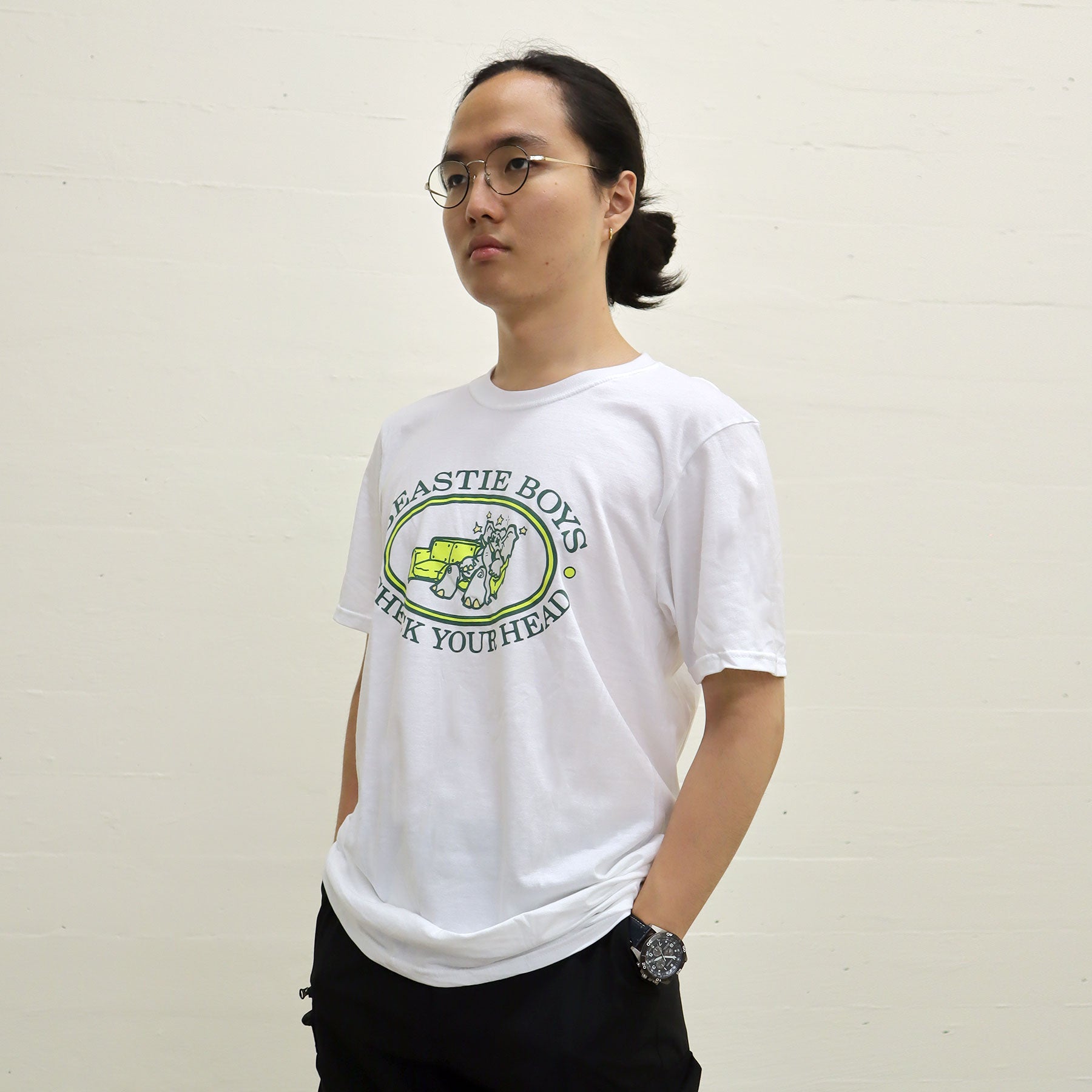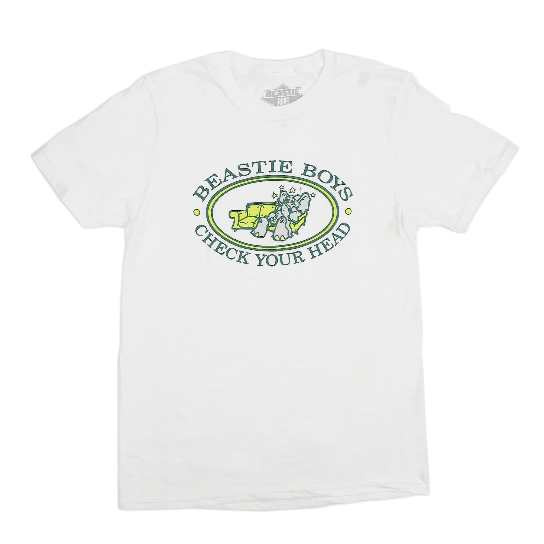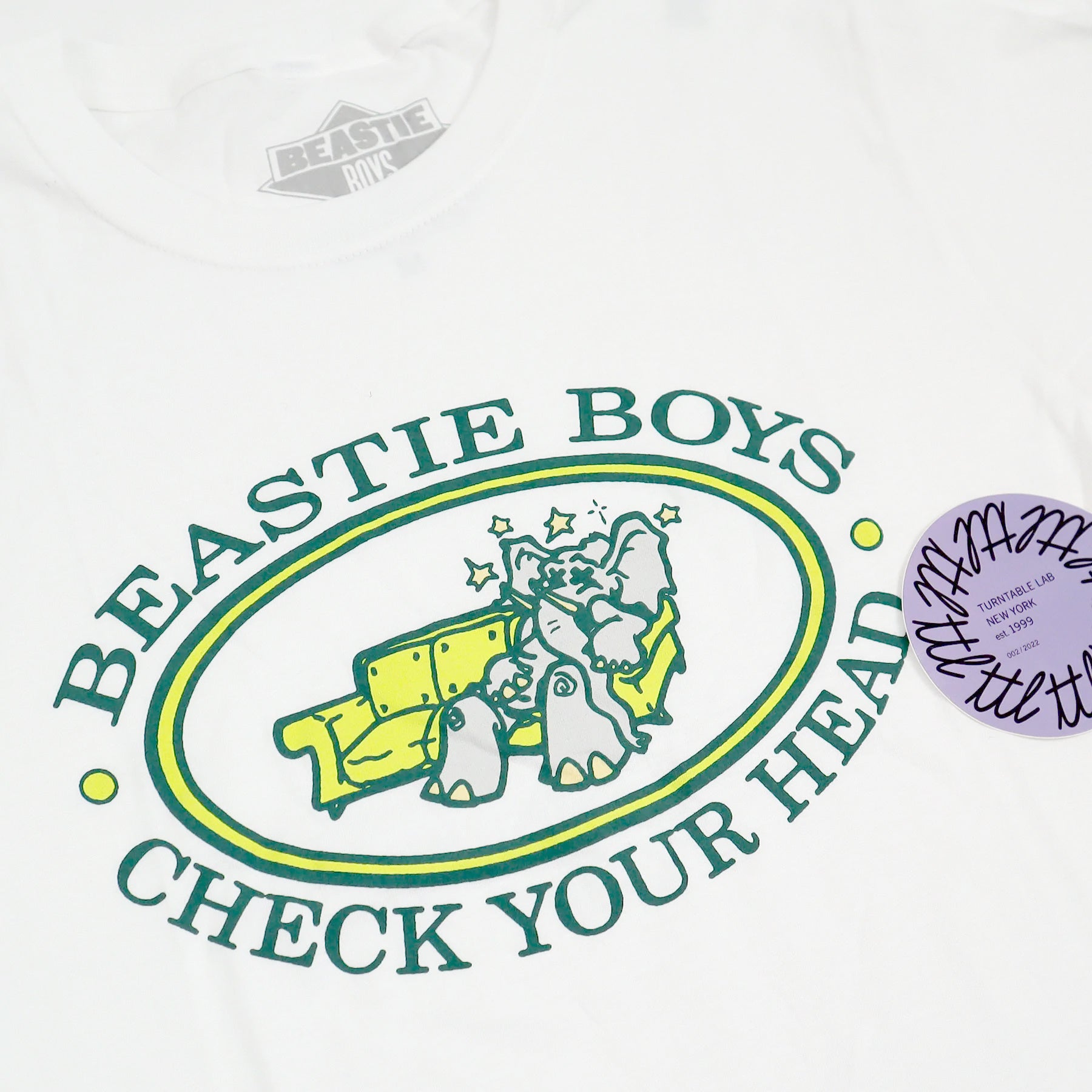 "THE CHECK YOUR HEAD WHITE T-SHIRT FEATURES THE BEASTIE BOYS' BROOKLYN DUST ELEPHANT LOGO, DESIGNED BY TODD JAMES, PRINTED ON A SUPER SOFT WHITE T-SHIRT."