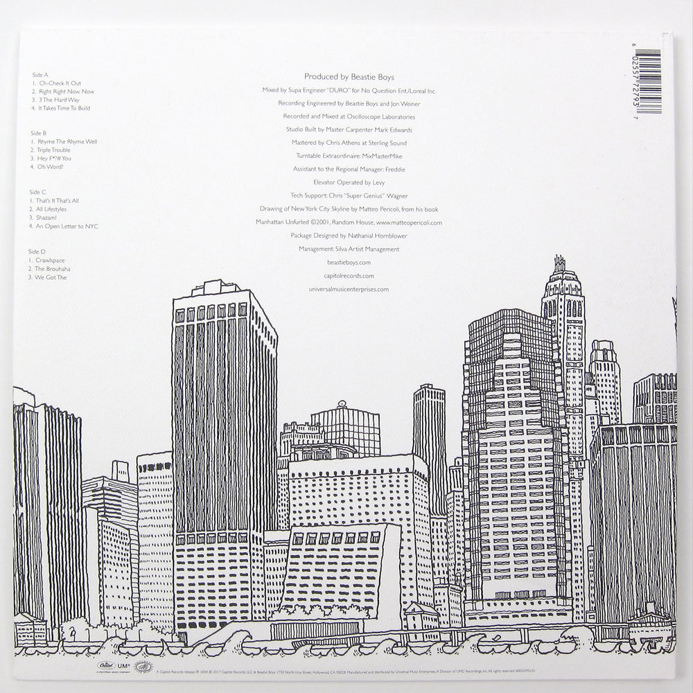 Special edition 15th anniversary repress. Post-9/11 album from The 5 Boroughs' own! Mike D, MCA, and Ad-Rock pay tribute to the city that raised them, offering commentary on the wider implications of the tragedy that shook up NY (and the world) some years prior. Gotta love the hand-drawn(?) cover showing the Twin Towers still standing. The conviction and lyrical dexterity with which the trio employs to talk about the issues is where the genius of this full-length lies at: the obscure pop-culture references, humor, and tales of old New York are all classic Beasties but updated and specially formulated for consumption by the world still recovering from ramifications the September 11 attacks. In terms of production, the Boys benefit from MixMaster Mike's one-turntable-and-a-mixer style, and the stripped down beats offer plenty of room for the rhymes to shine on. Highlights: "An Open Letter To NYC," "Ch-Check It Out," "Triple Trouble," "Hey Fuck You," and "Right Right Now Now." 2019 reissue on 180g blue vinyl.