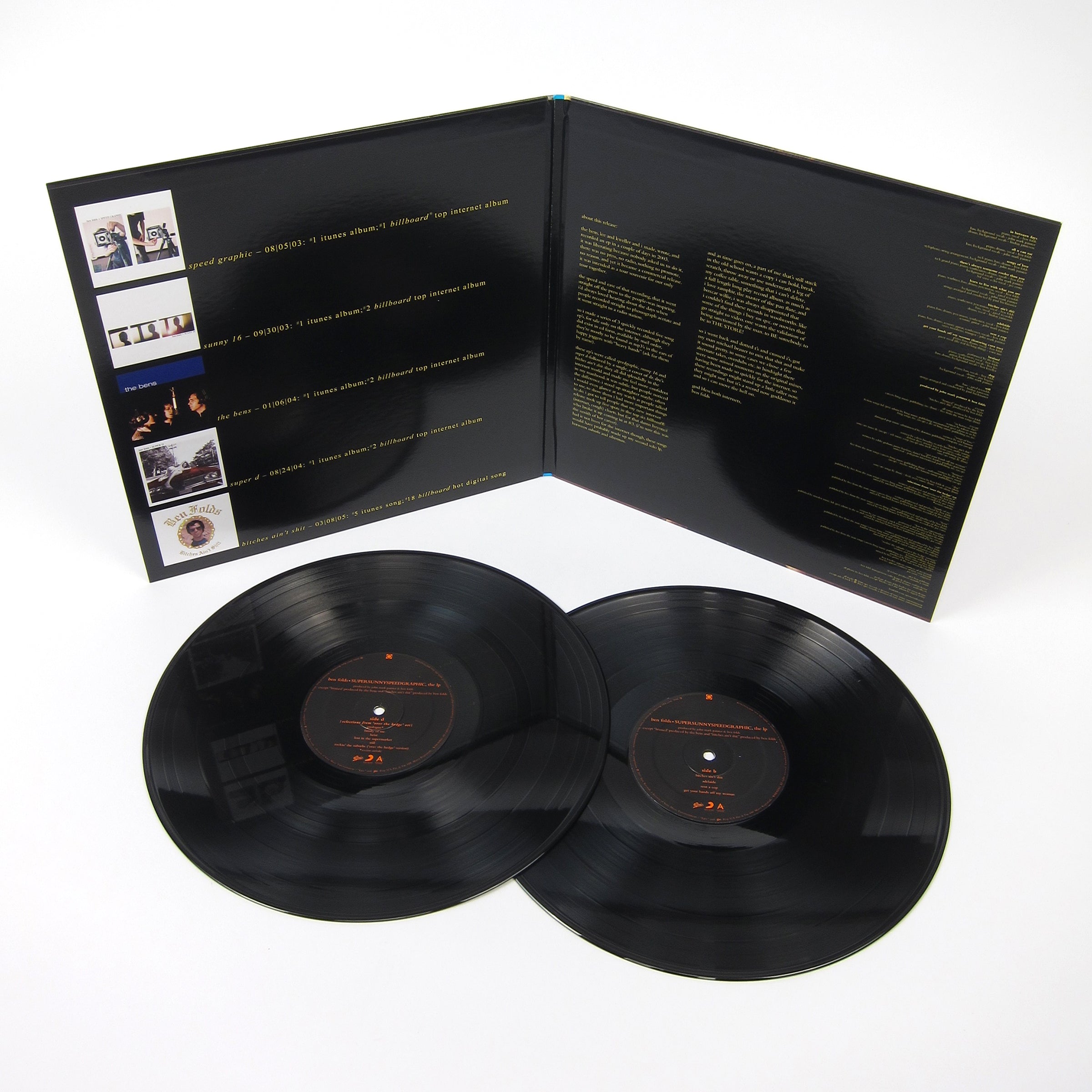 As evidenced by the title, Supersunnyspeedgraphic, The LP includes songs from Ben Folds's three EPs, Super D, Sunny 16, and Speed Graphic. Also, some of the one-off highlights released between his first and second solo LPs, such as "Bitches Ain't Shit," a cover of Dr. Dre (too faithful of a cover maybe, def. some super uncomfortable moments on here). There are three other coverss included on the record: "In Between Days" (The Cure), "Songs of Love" (The Divine Comedy), and "Get Your Hands Off My Woman" (The Darkness). All the songs have been recorded and rebuffed w/ overlays and instrumentation, and many are different takes of previously released versions. The release ranges in mood, from the sentimental to the more solemn, and it also points to the varied influences that shaped the musician (just peep who he chose to cover). In addition to aforementioned picks, check out "There's always Someone Cooler Than You," "In Between Days," and "Adelaide."